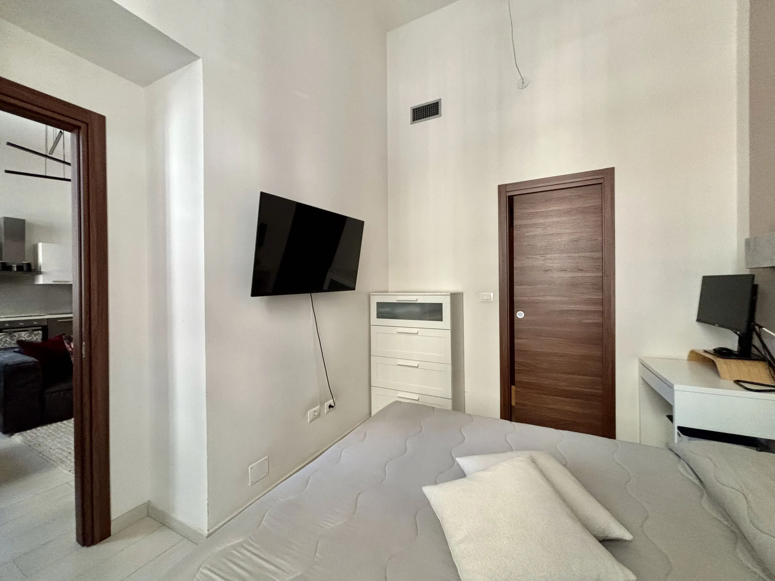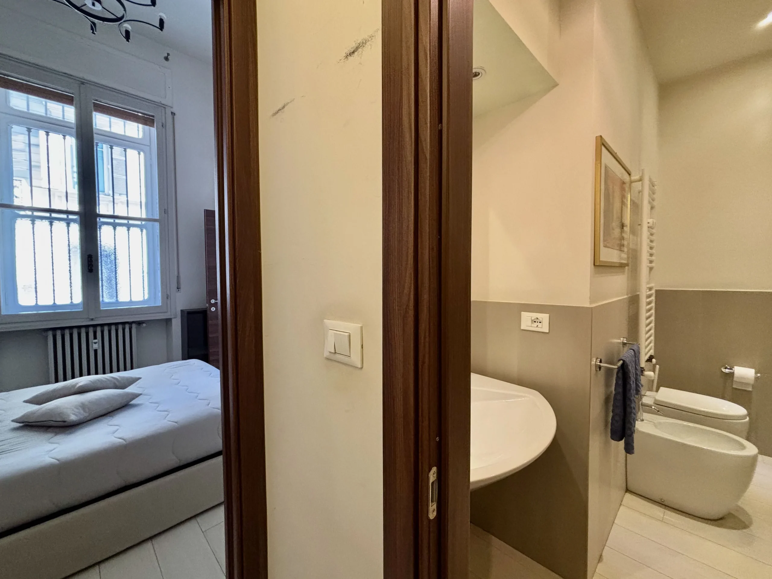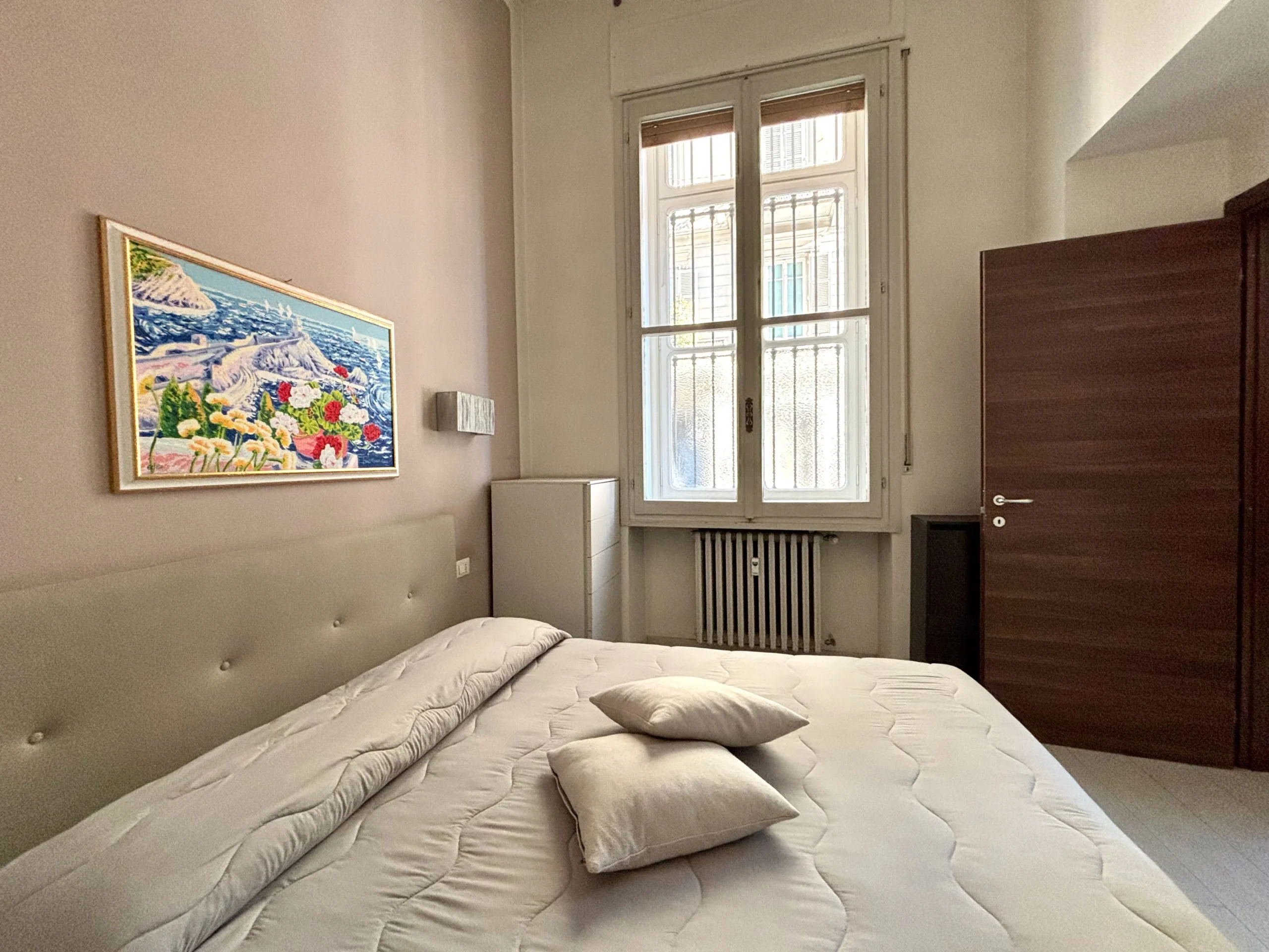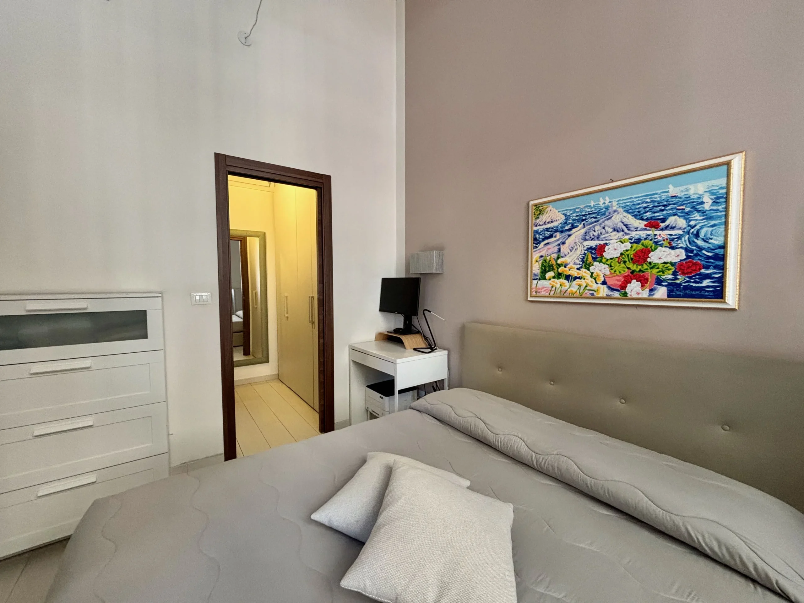 La camera da letto matrimoniale è un rifugio silenzioso, con il suo bagno privato e una splendida cabina armadi su misura, realizzata nello spazio di passaggio tra i due ambienti.