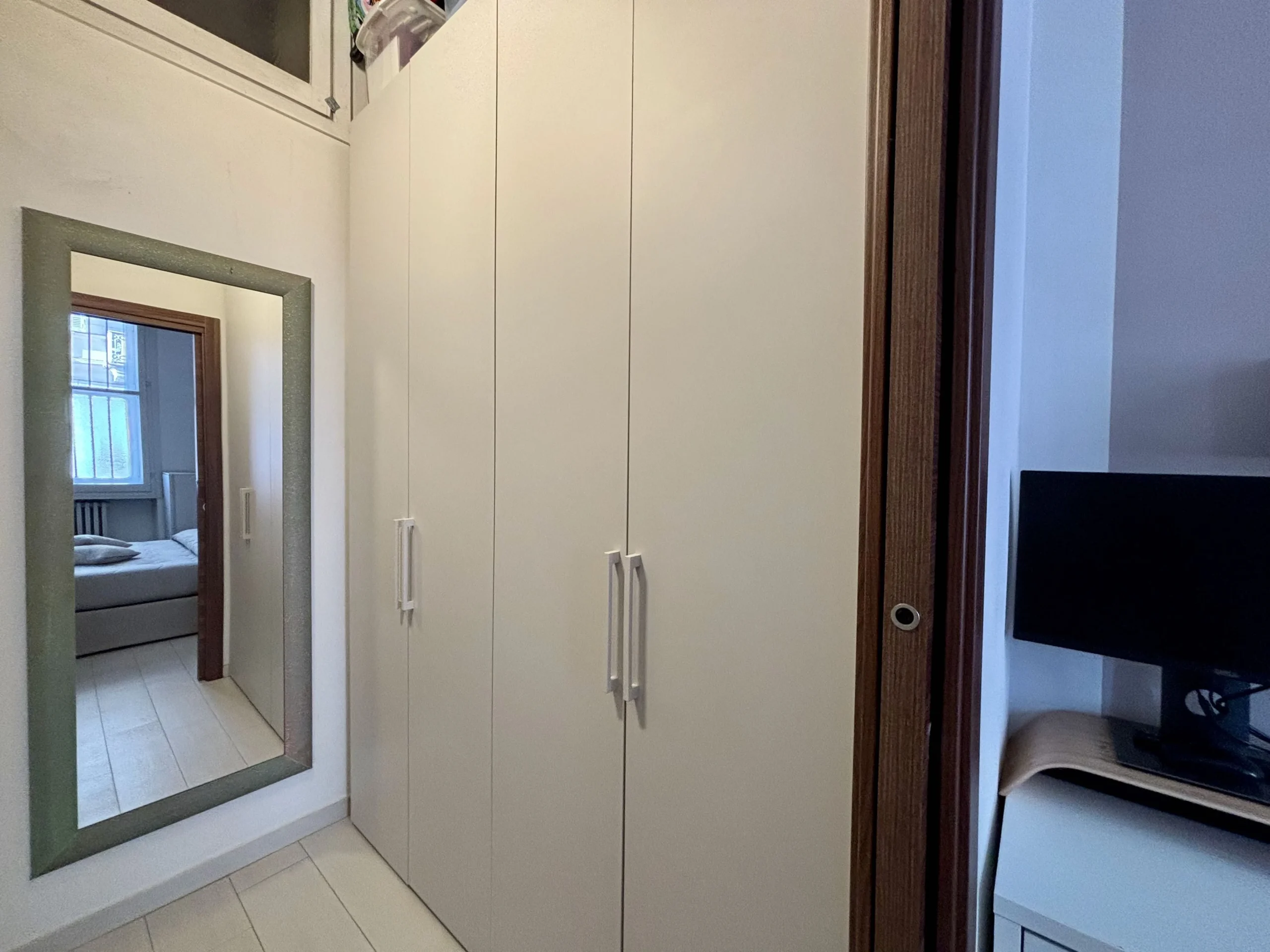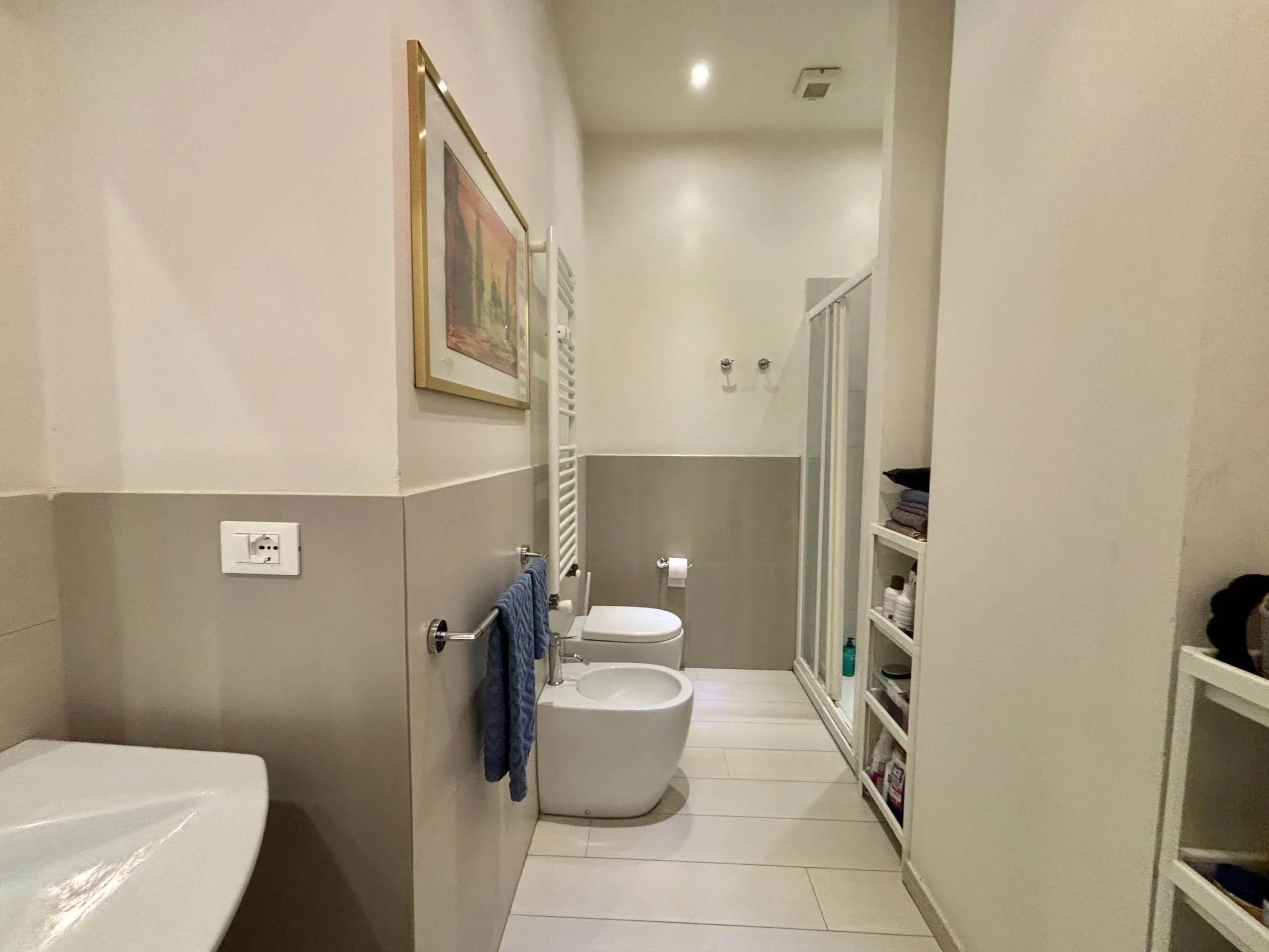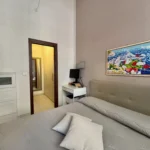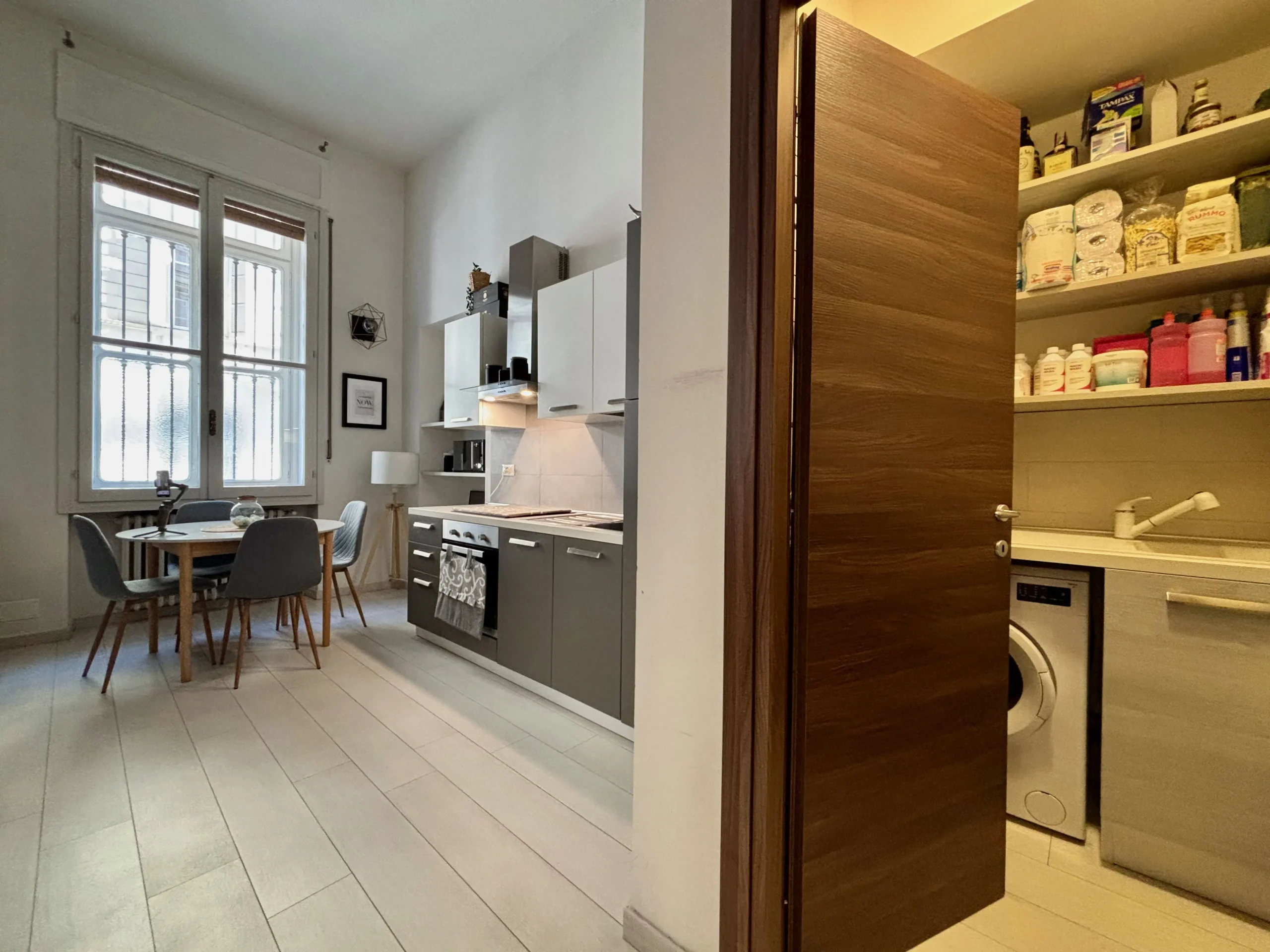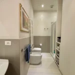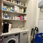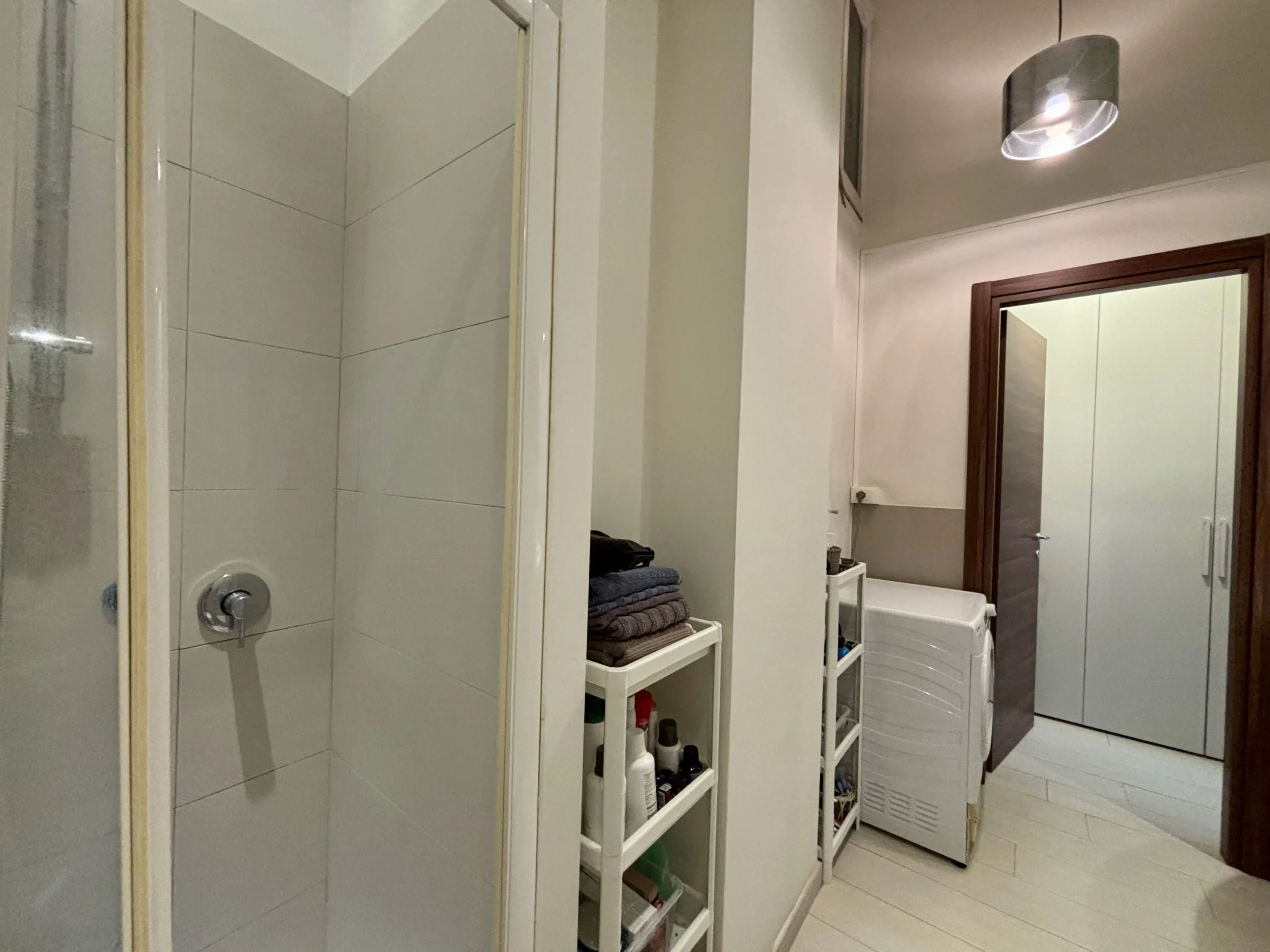 Una seconda camera studio con affaccio sul vano scale si trova nei pressi dell’ingresso insieme ad un secondo bagno con doccia e alla zona lavanderia/ripostiglio perfettamente organizzata.