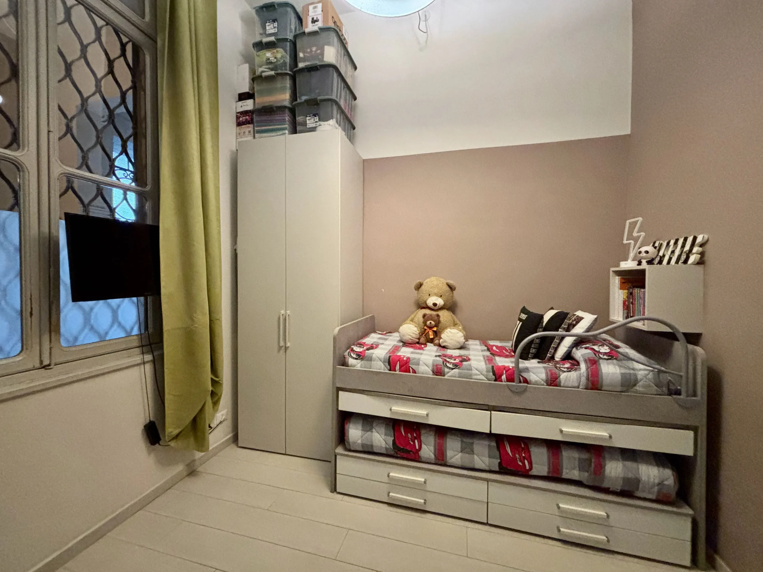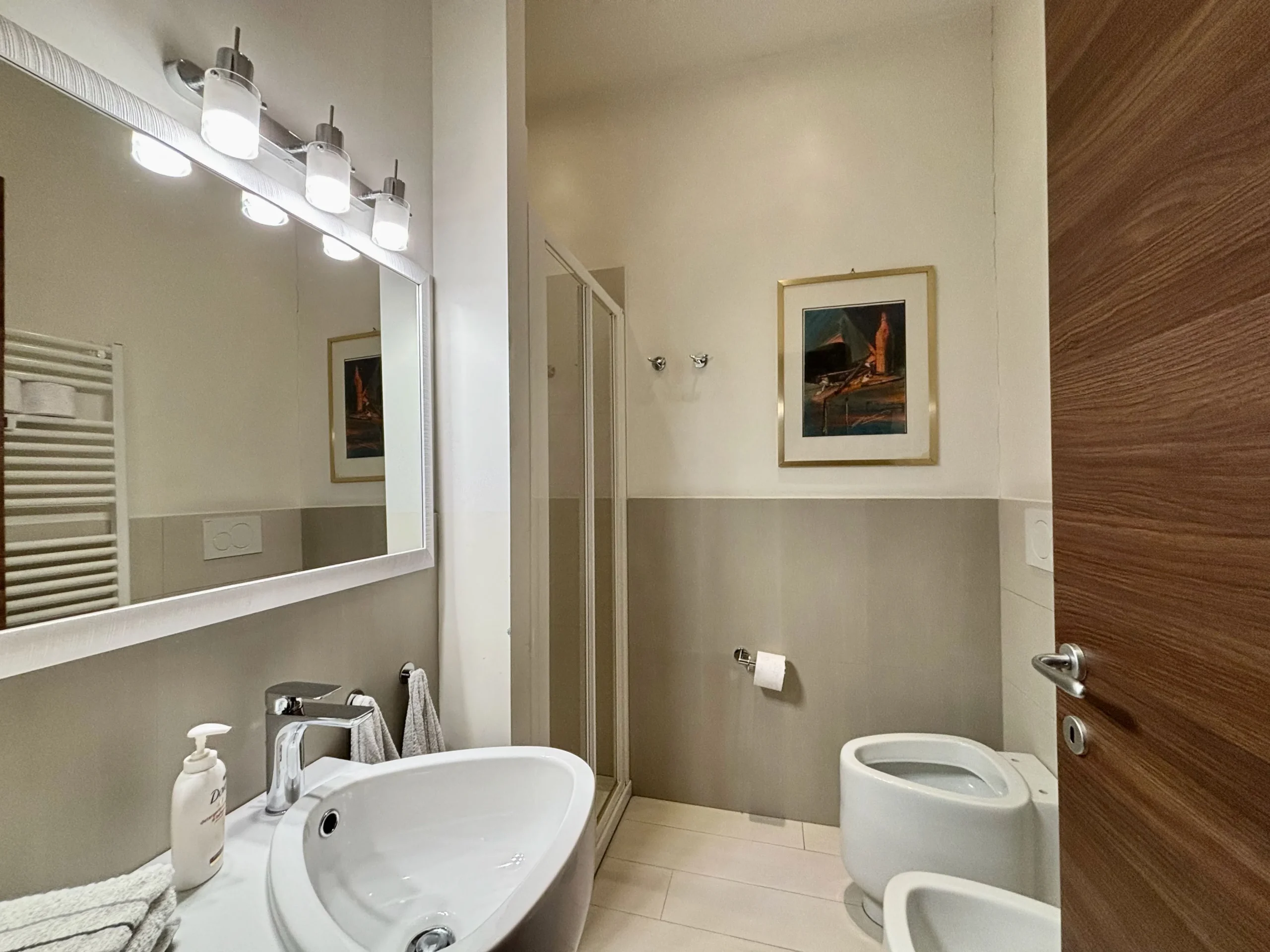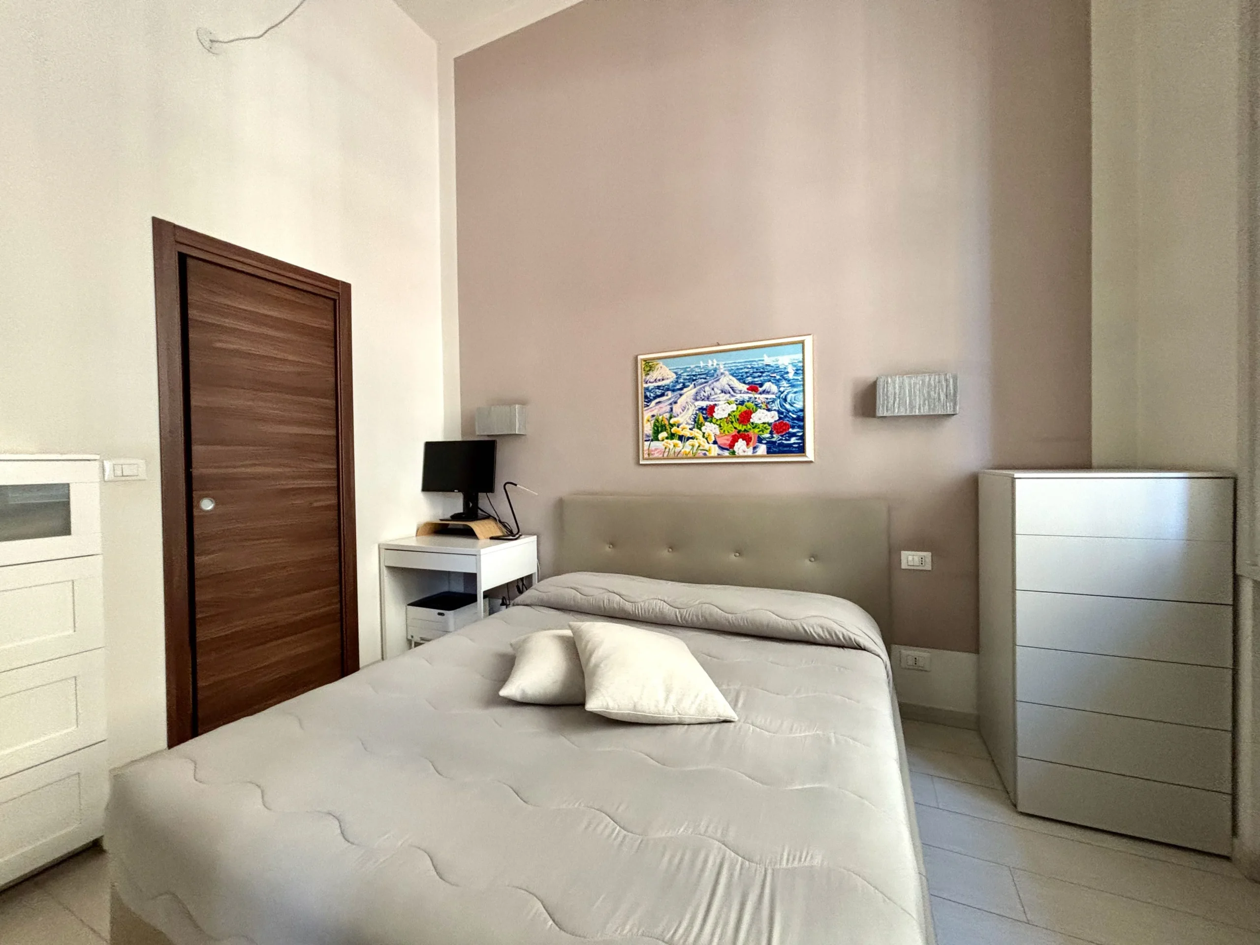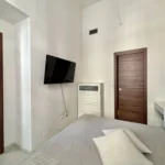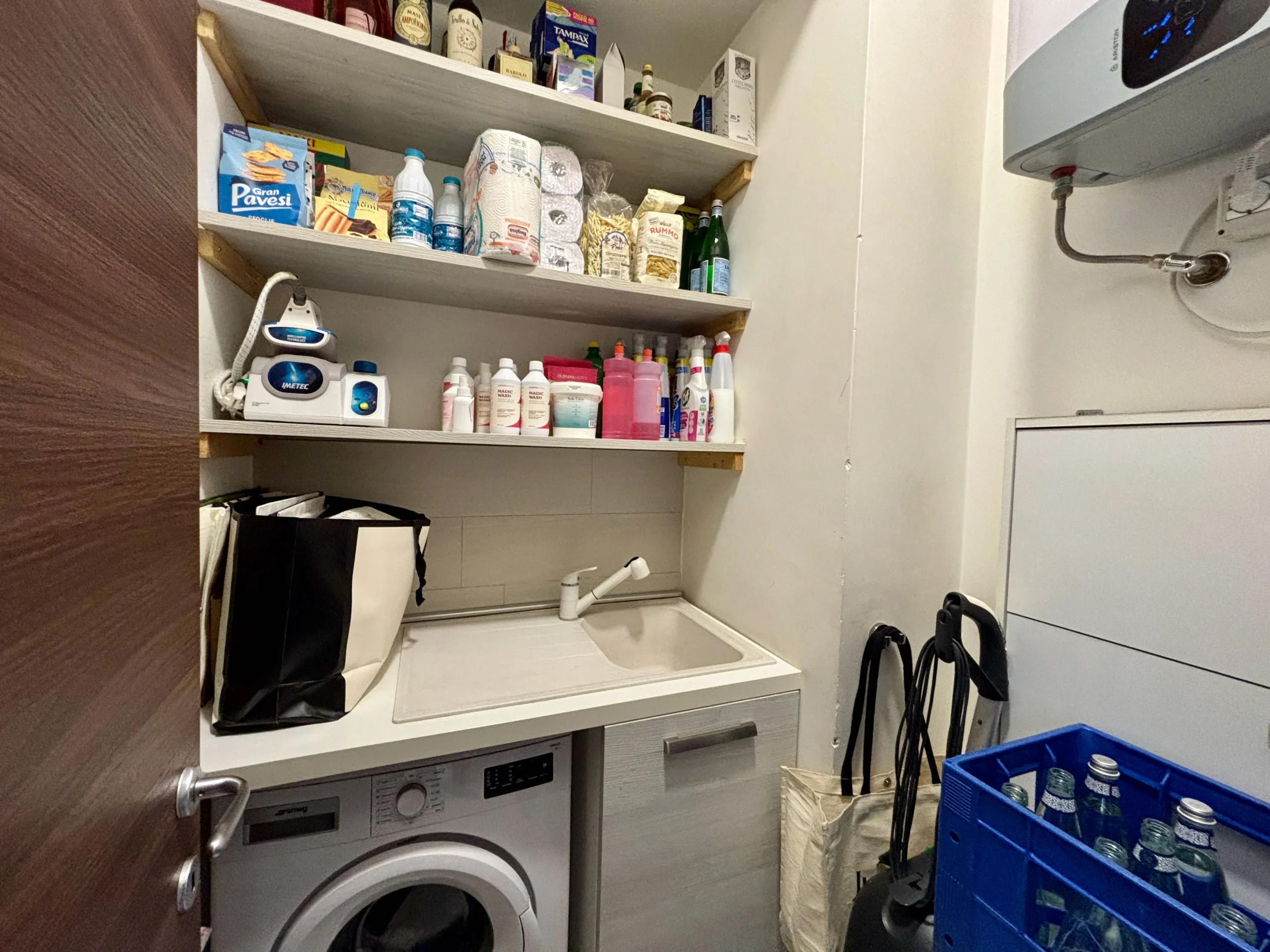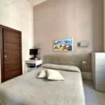 Una seconda camera studio con affaccio sul vano scale si trova nei pressi dell’ingresso insieme ad un secondo bagno con doccia e alla zona lavanderia/ripostiglio perfettamente organizzata.