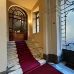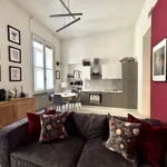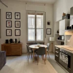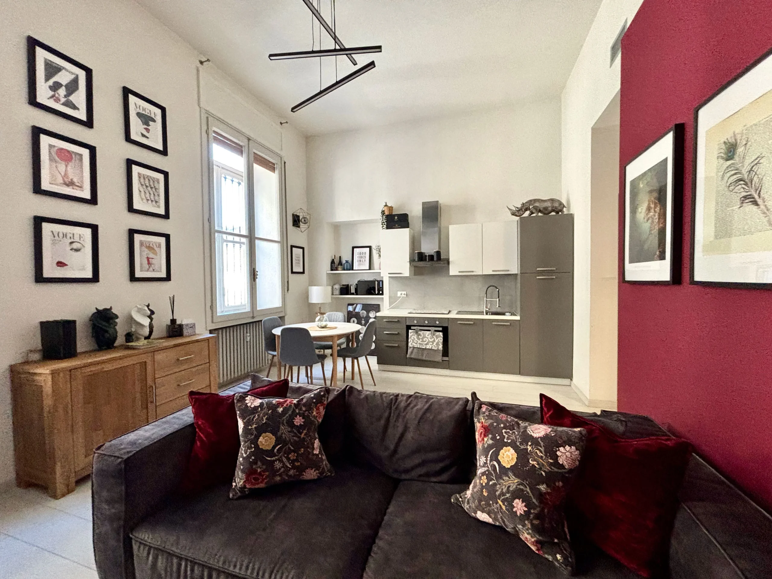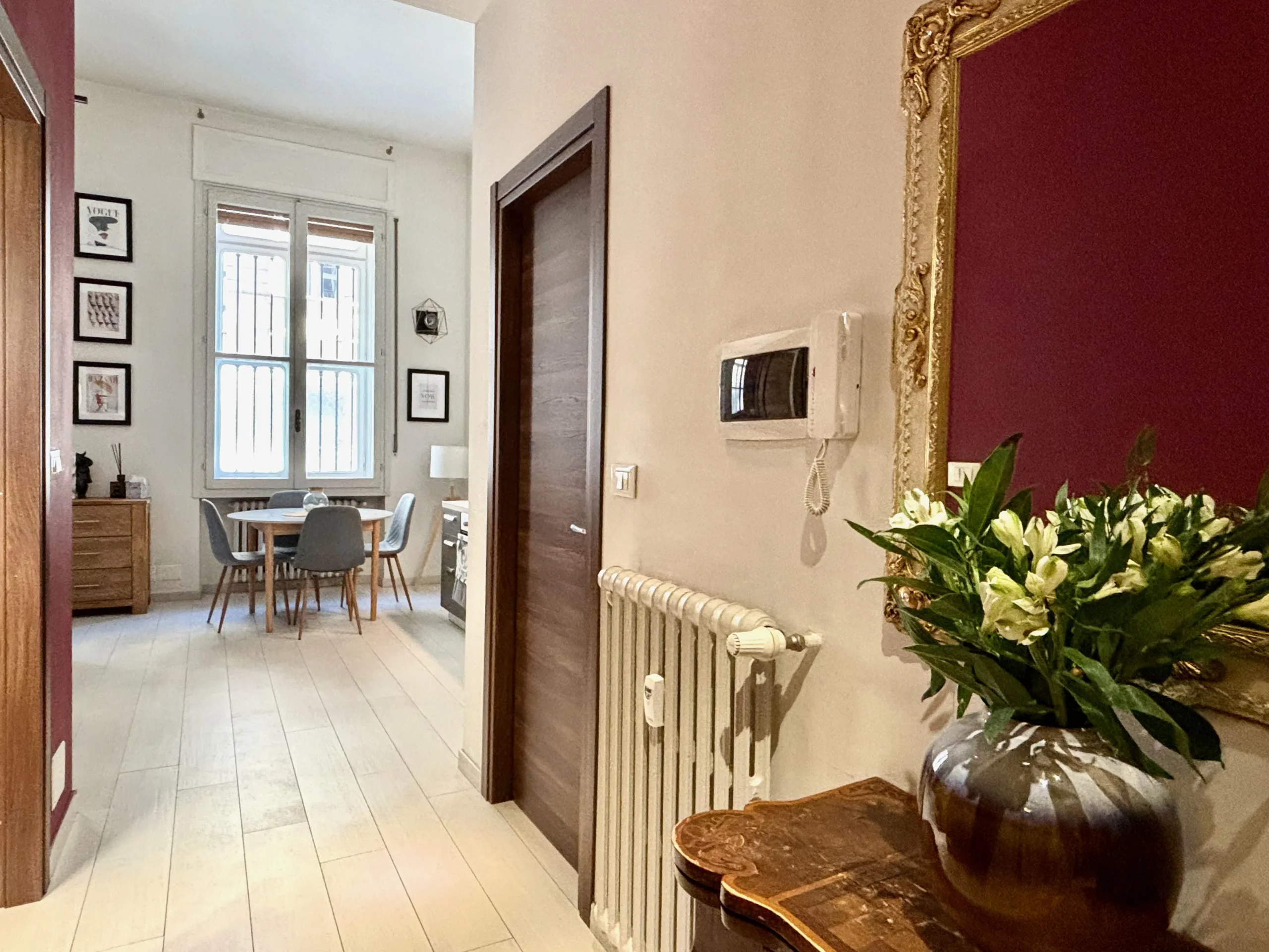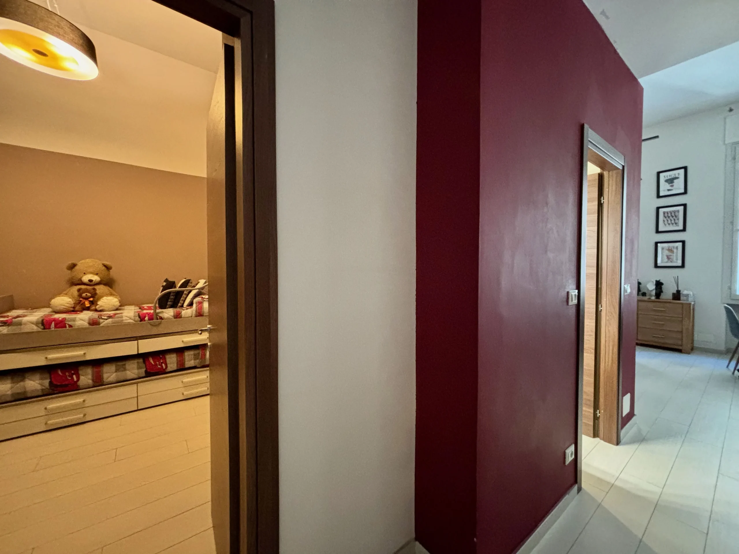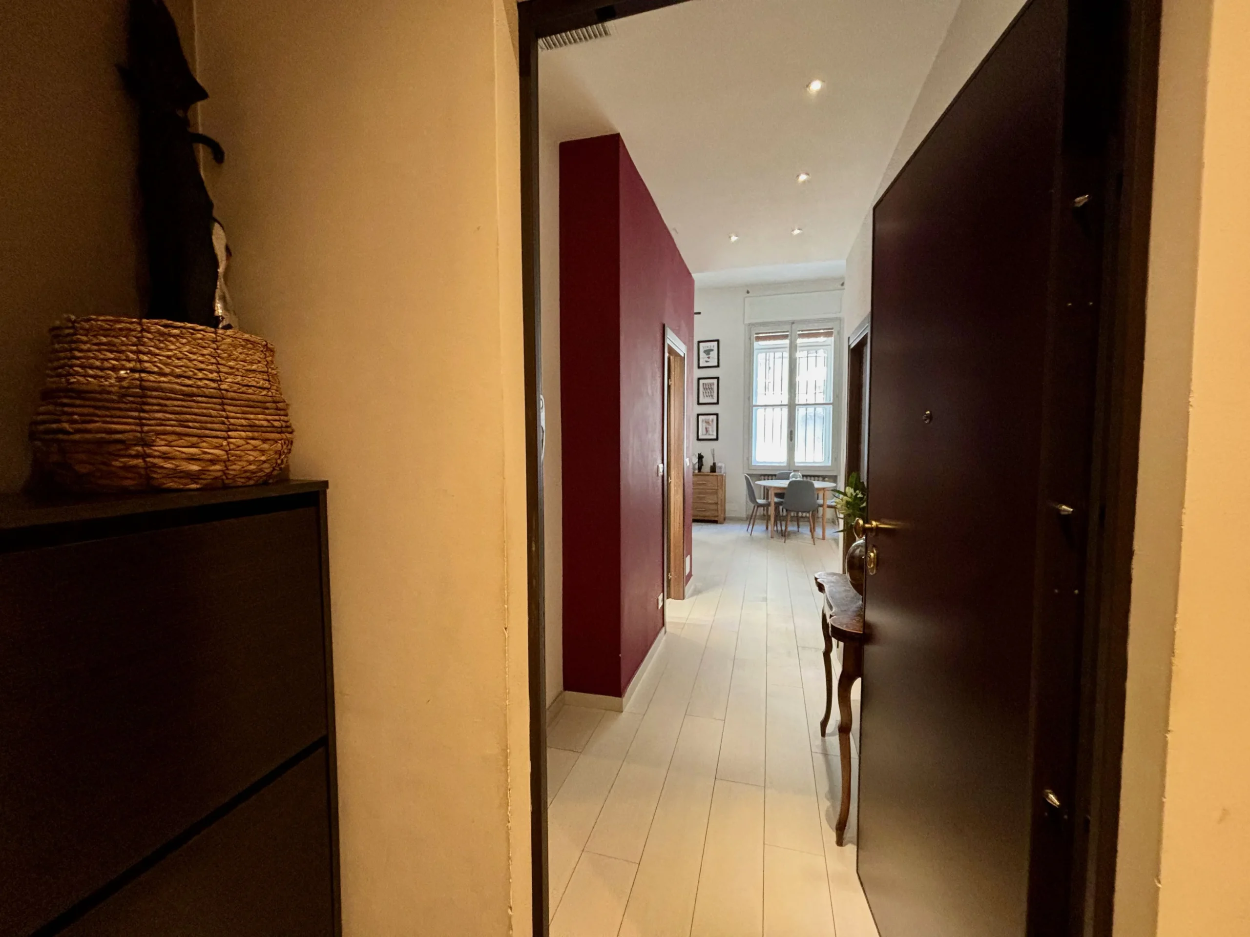L’ingresso apre sul corridoio centrale che accompagna verso la zona giorno, accogliente e luminosa dove la cucina e l’area relax dialogano con equilibrio, mentre i toni borgogna e verde creano un’atmosfera raffinata e contemporanea. Gli alti soffitti donano respiro e una naturale eleganza agli ambienti.