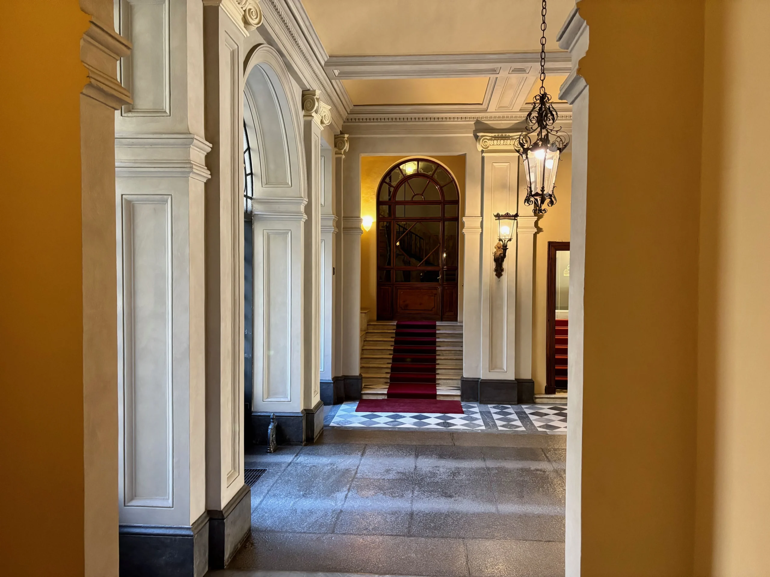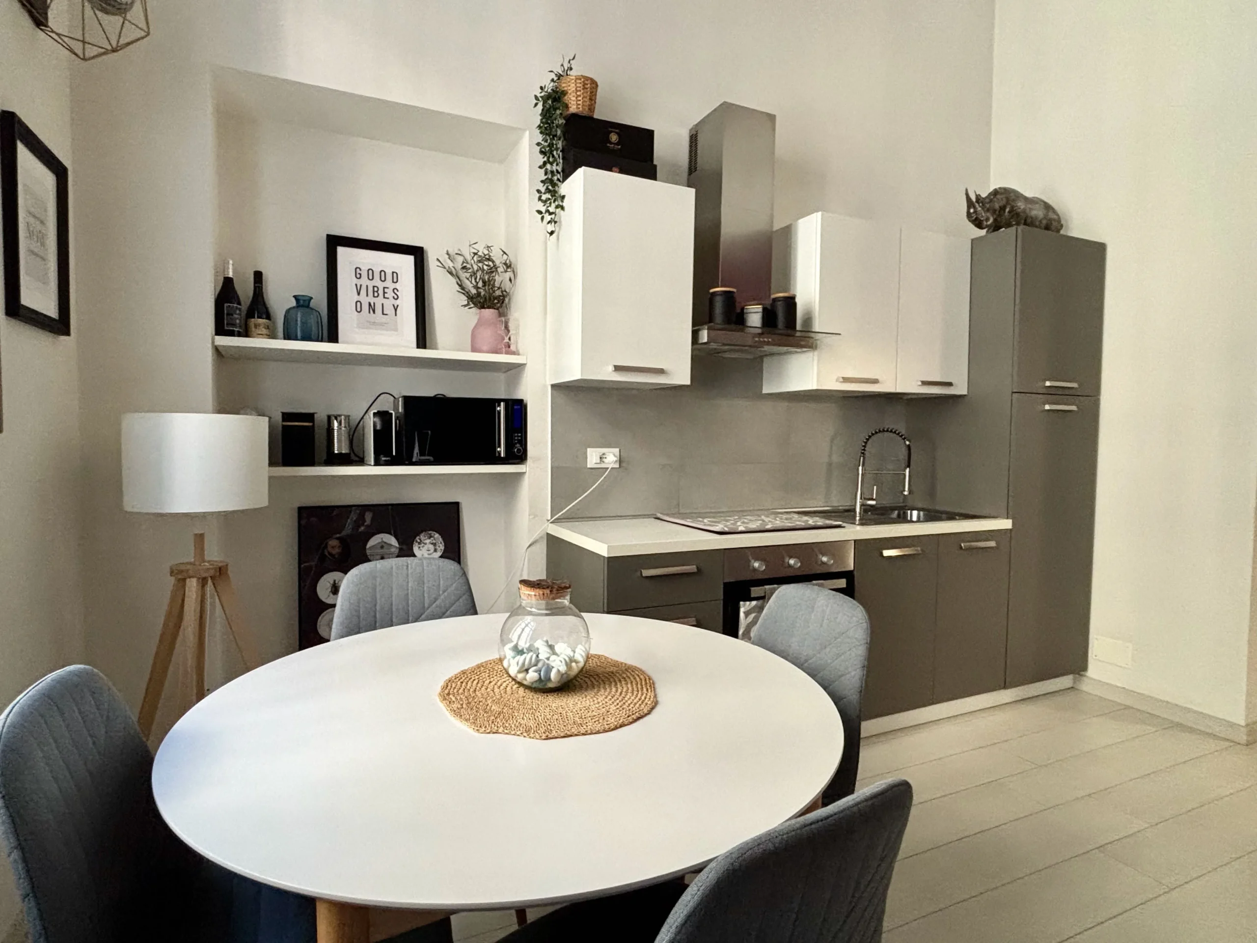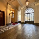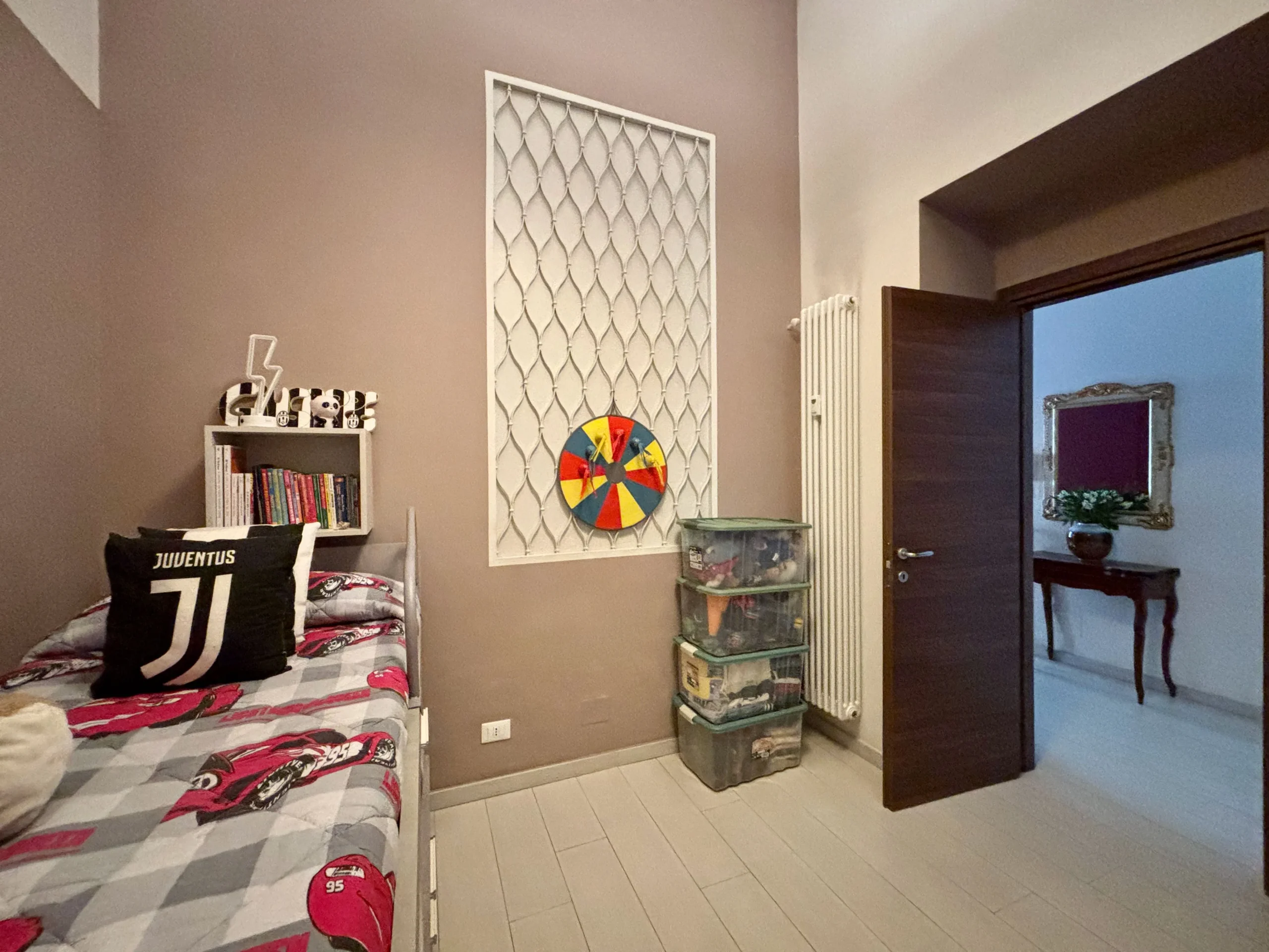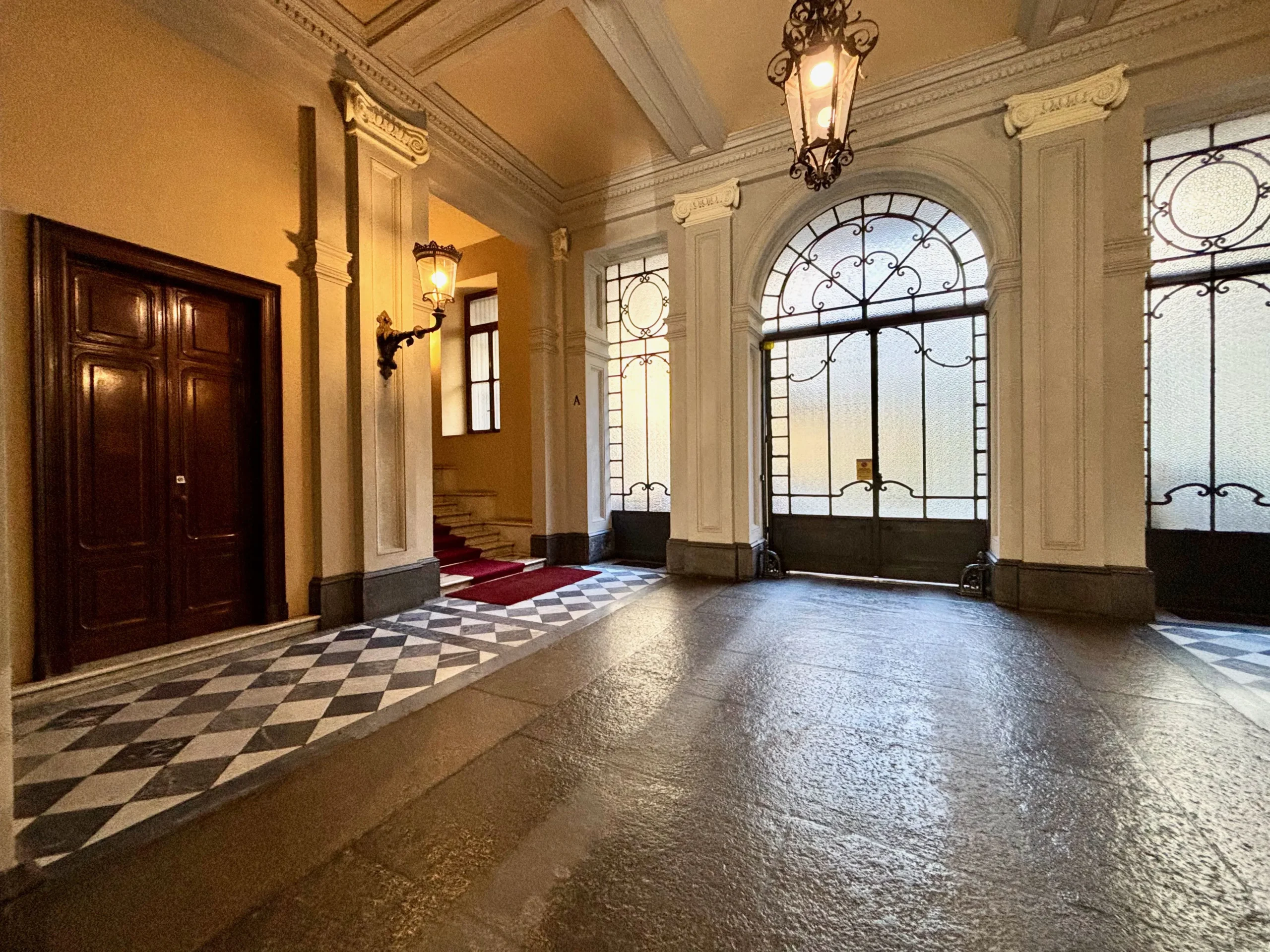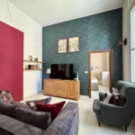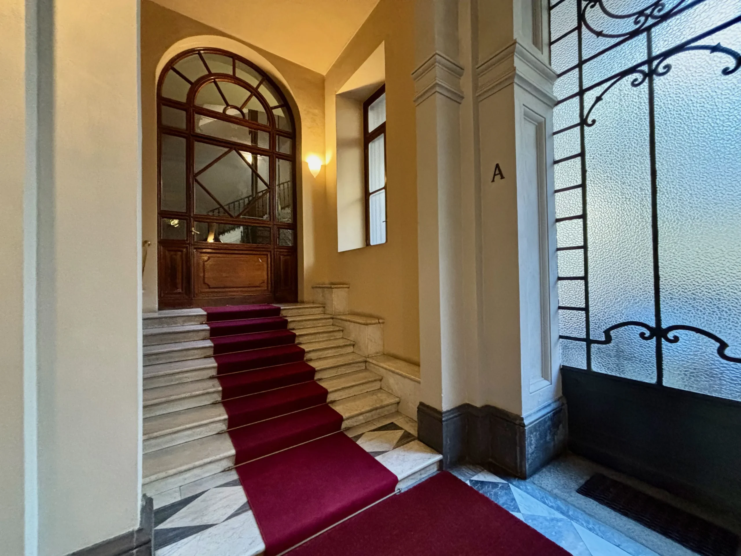 L’ingresso apre sul corridoio centrale che accompagna verso la zona giorno, accogliente e luminosa dove la cucina e l’area relax dialogano con equilibrio, mentre i toni borgogna e verde creano un’atmosfera raffinata e contemporanea. Gli alti soffitti donano respiro e una naturale eleganza agli ambienti.