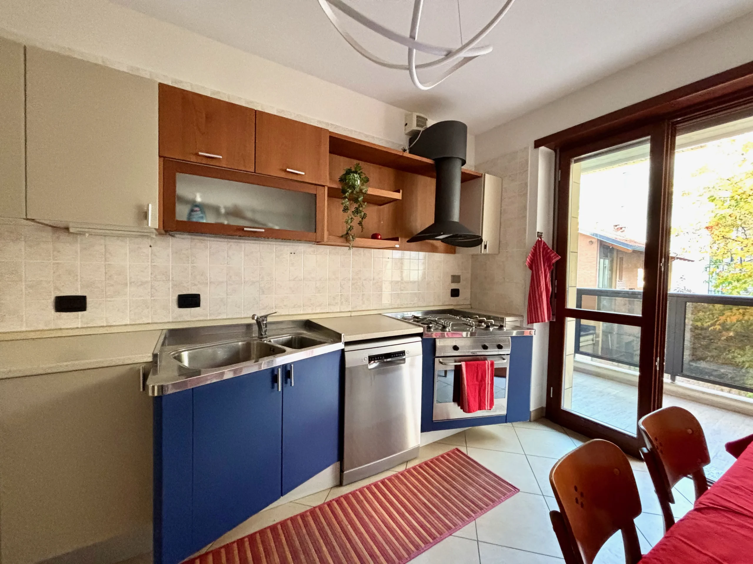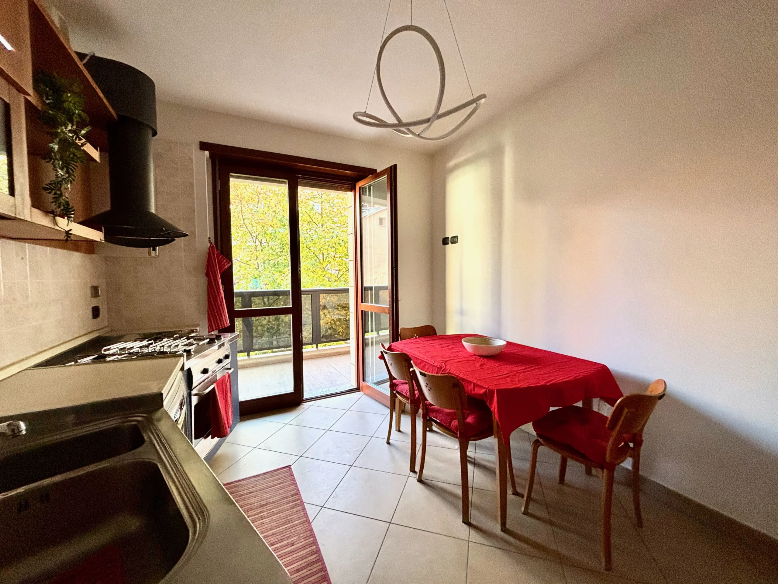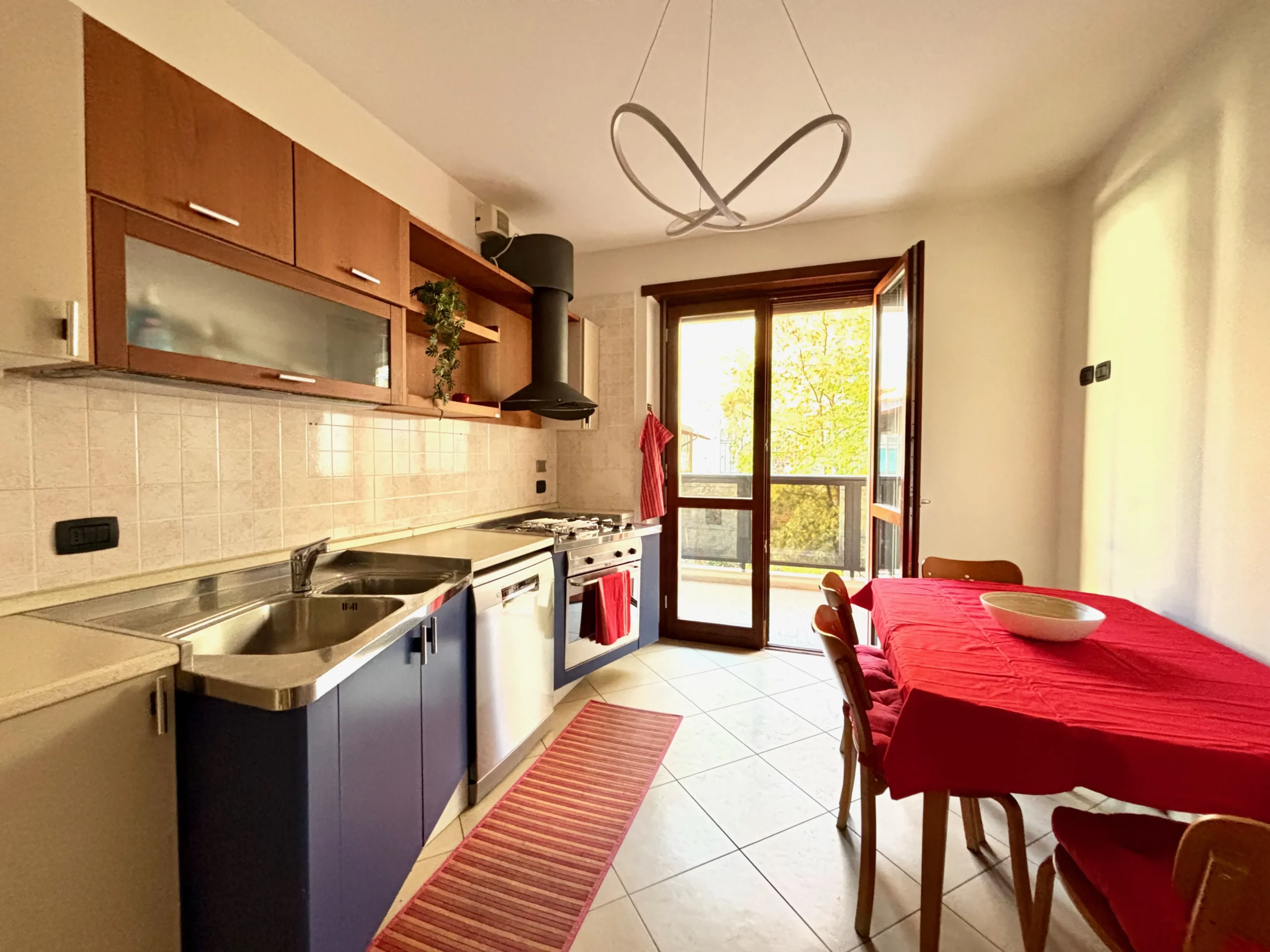 La cucina abitabile, spaziosa e completamente attrezzata con elettrodomestici, esce sul secondo terrazzo: uno spazio generoso e affacciato sul verde interno cortile, perfetto per cene estive, momenti di relax e convivialità all’aperto.