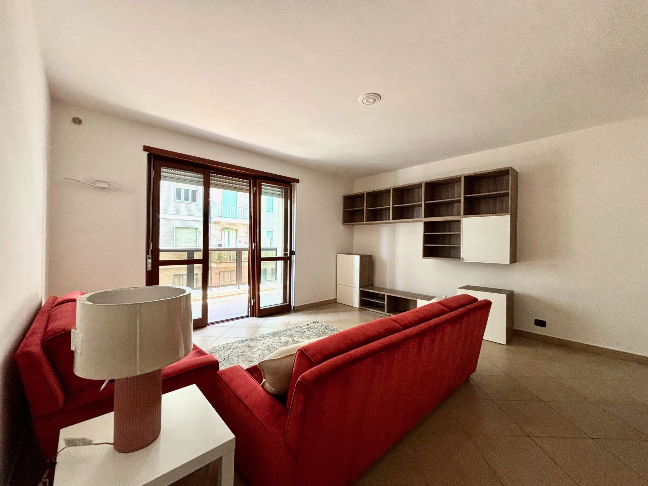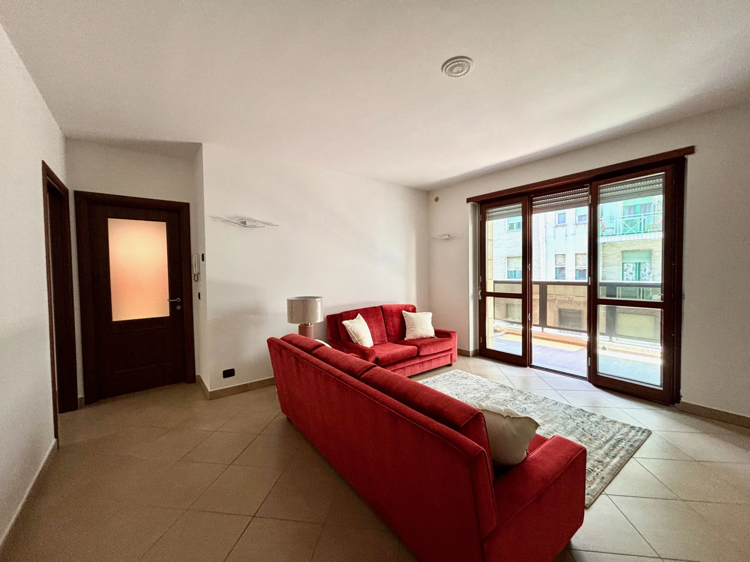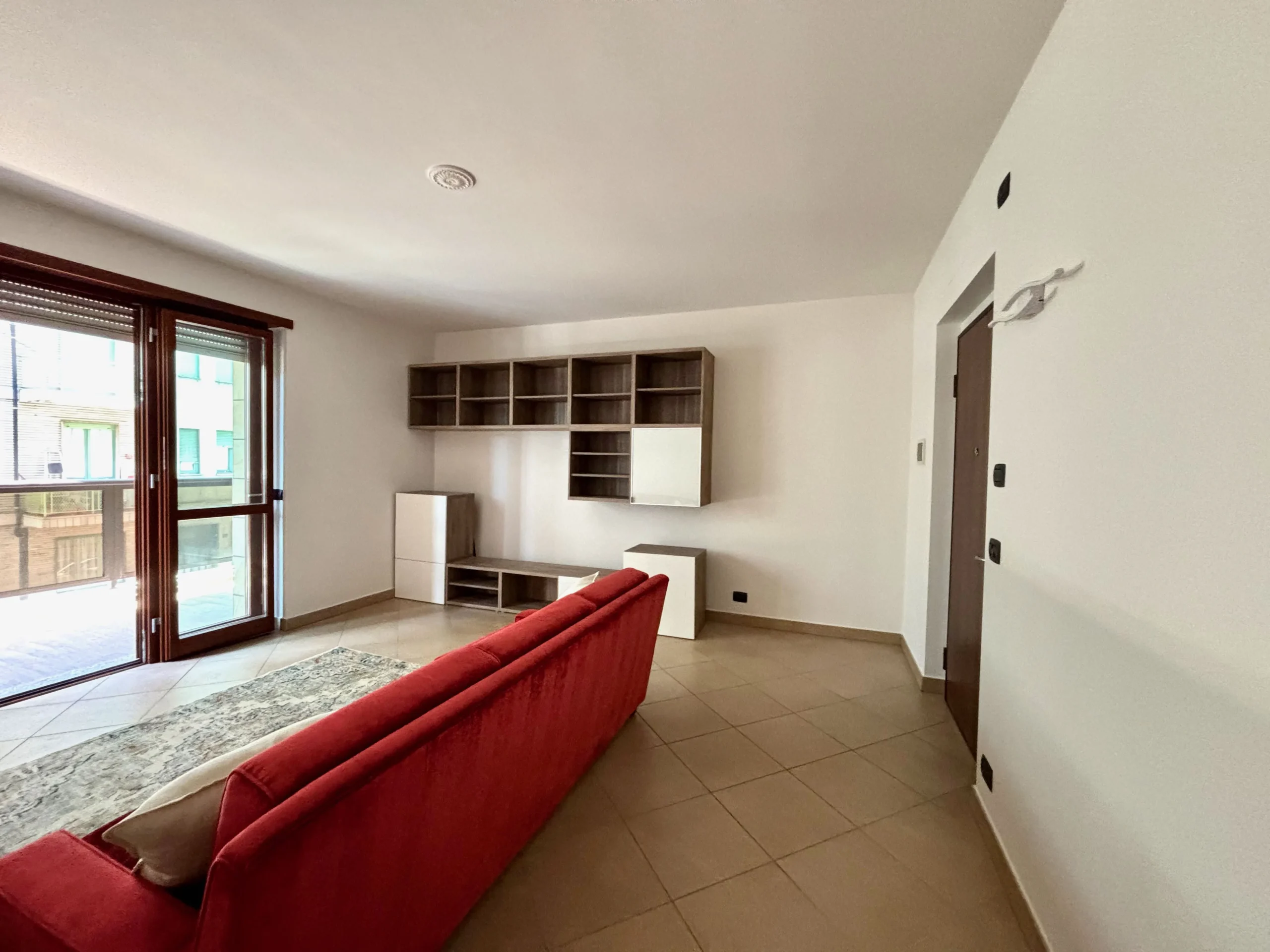 L’ingresso apre sull’ampio salone luminoso, con uscita sul primo terrazzo, che si guarda via Guido Rey.