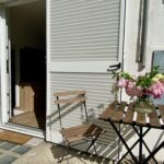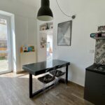 La grande portafinestra della cucina affaccia sul silenzioso interno cortile.