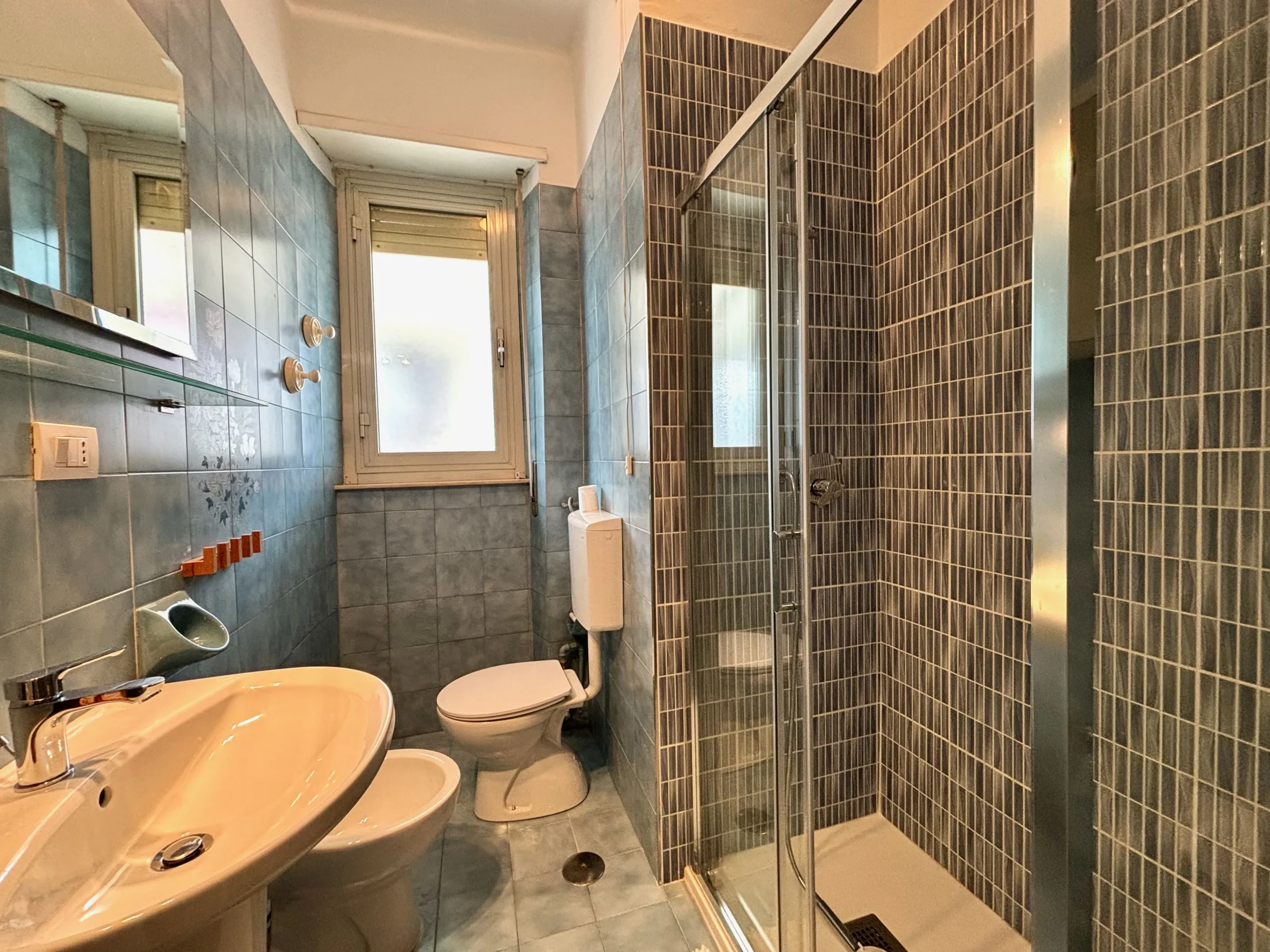 Il bagno, posizionato tra zona giorno e zona notte, è finestrato, completo di doccia e lavatrice.