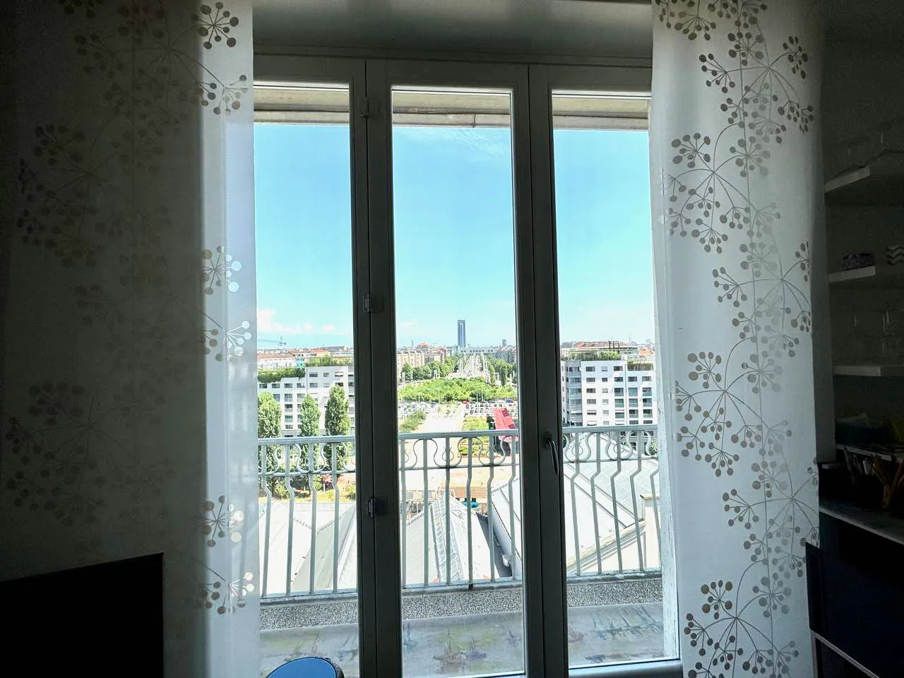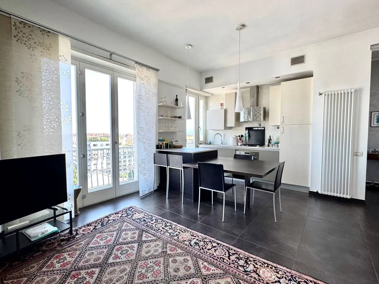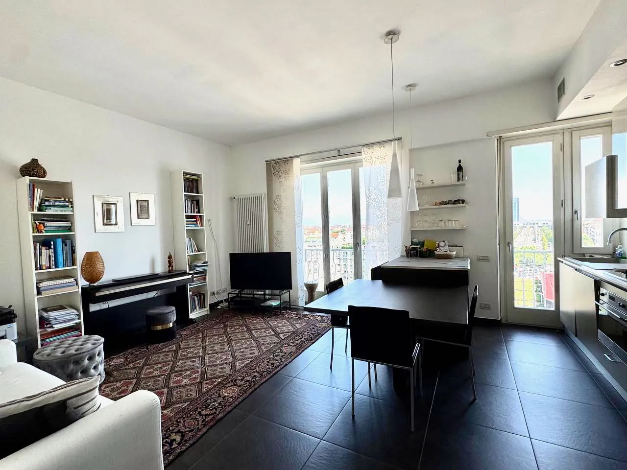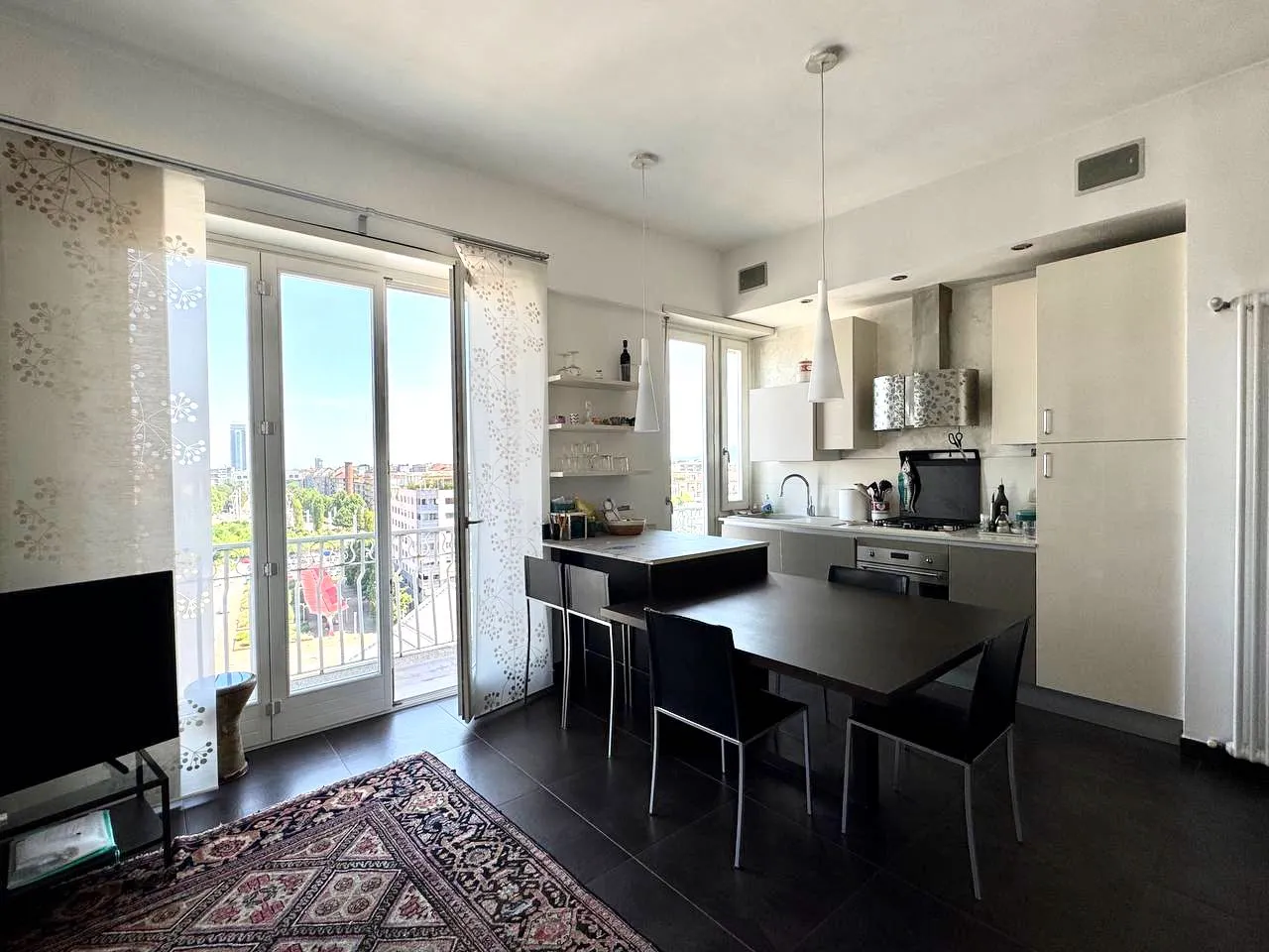 Ingresso su zona a giorno con cucina a vista, camera da letto, bagno, balcone, ripostiglio, cantina. Nono piano con ascensore, aria condizionata, 78mq, ristrutturato e arredato. Corso Rosselli 107, Torino