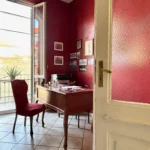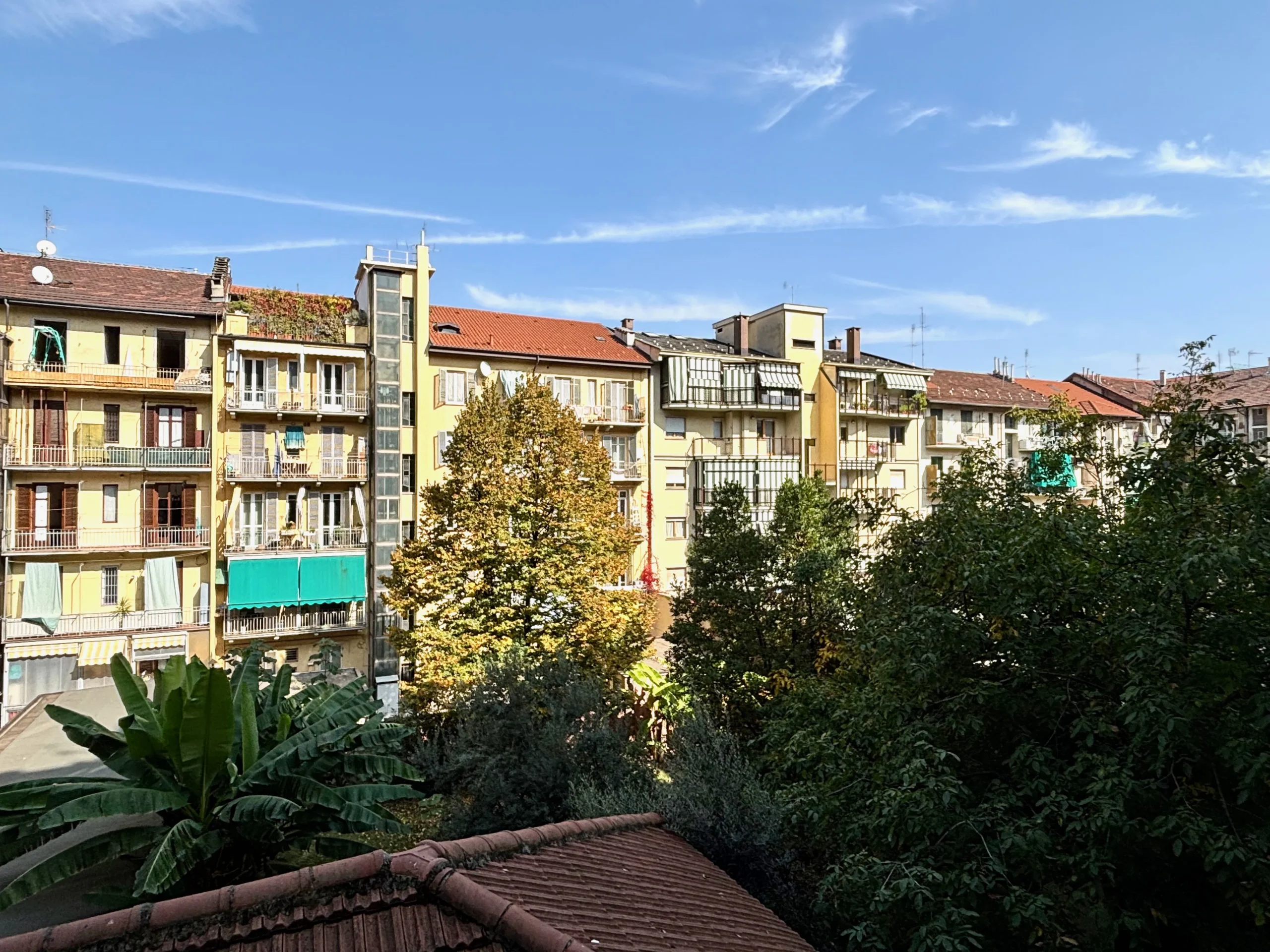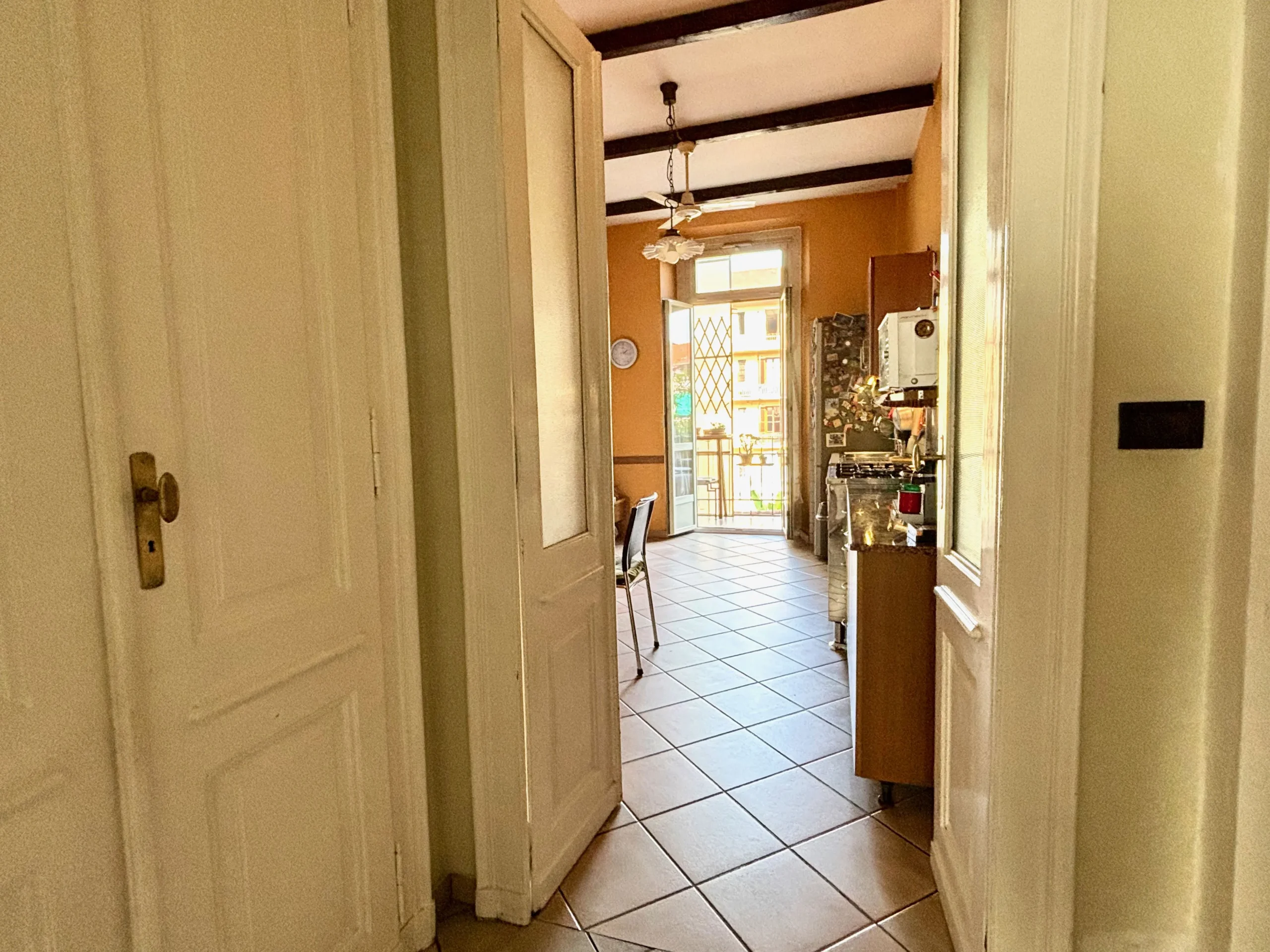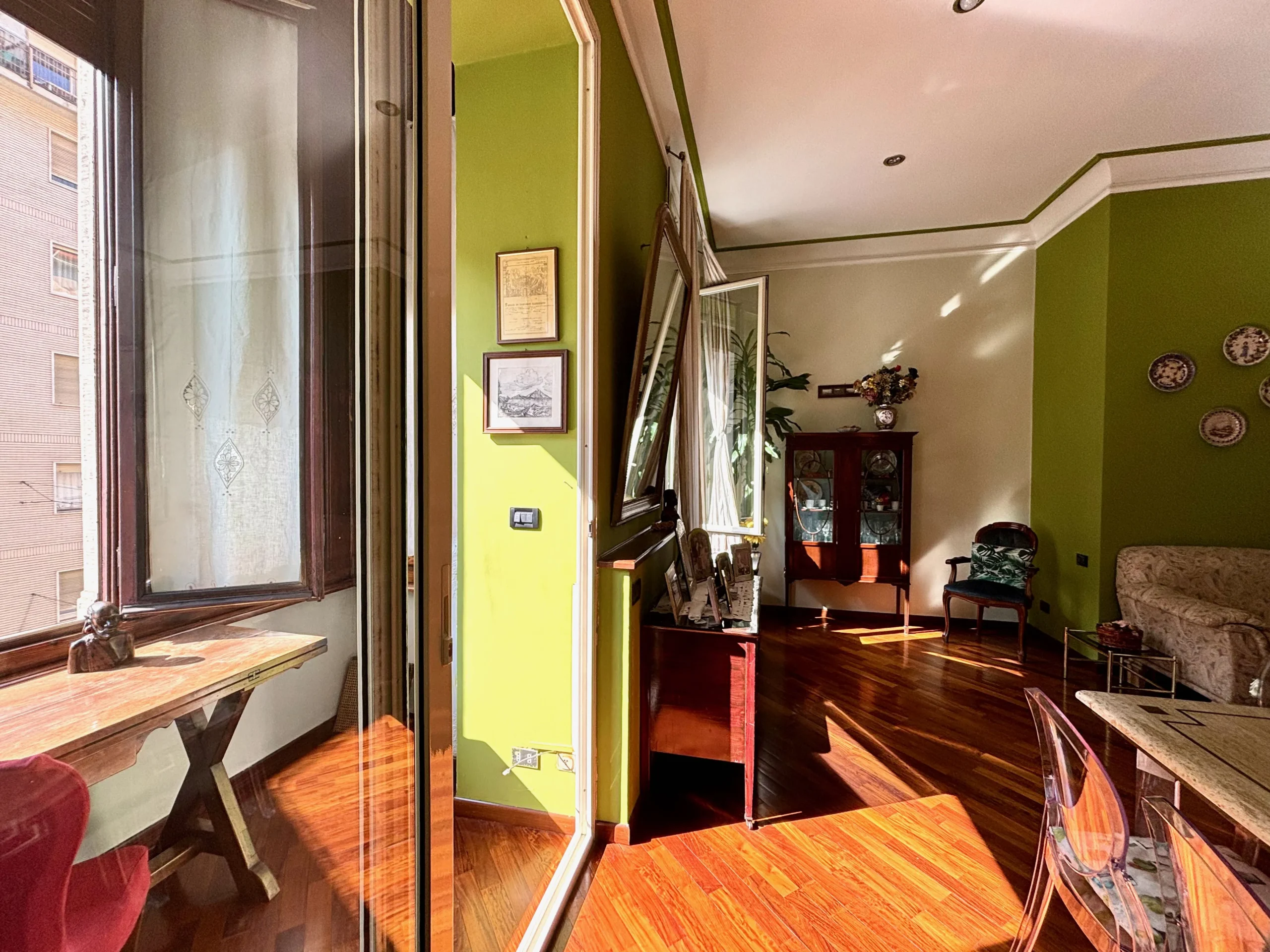 L’ingresso, spazioso e valorizzato dalla bussola originale, disimpegna con gli ambienti e conduce al luminoso soggiorno, impreziosito dal tipico e romantico bow window che affaccia su via Cibrario.