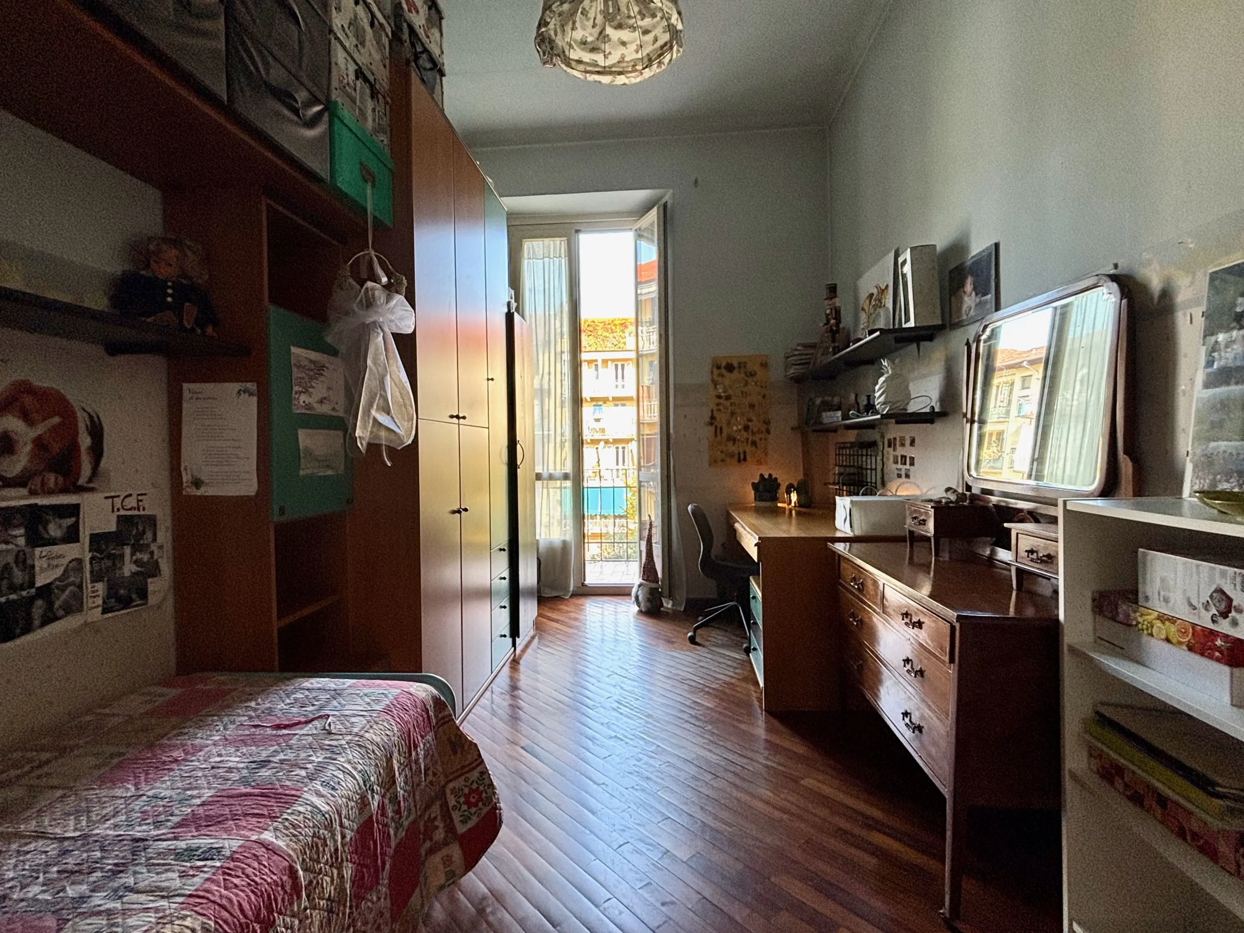 Ingresso, soggiorno, cucina, quattro camere, due bagni, ripostiglio, due balconi, cantina, soffitta. Secondo piano con ascensore, 183mq, stabile signorile. Via Cibrario 66, Torino.
