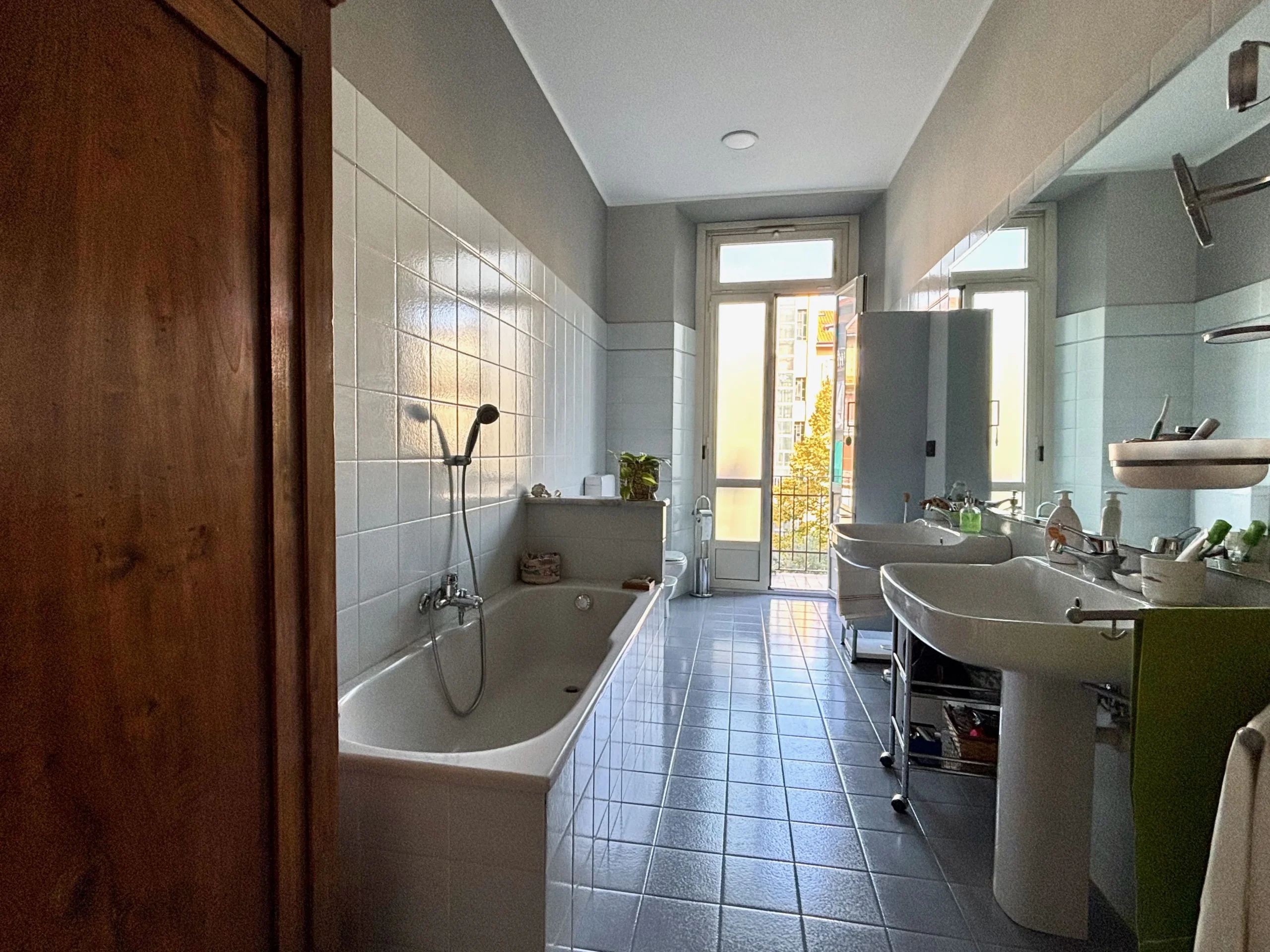 Due bagni finestrati, collocati in posizione centrale, servono comodamente tutti gli spazi: uno dotato di doccia, l’altro di vasca. Il bagno principale ha una comoda uscita sul balcone interno che corre lungo tutta la lunghezza dell’appartamento.
