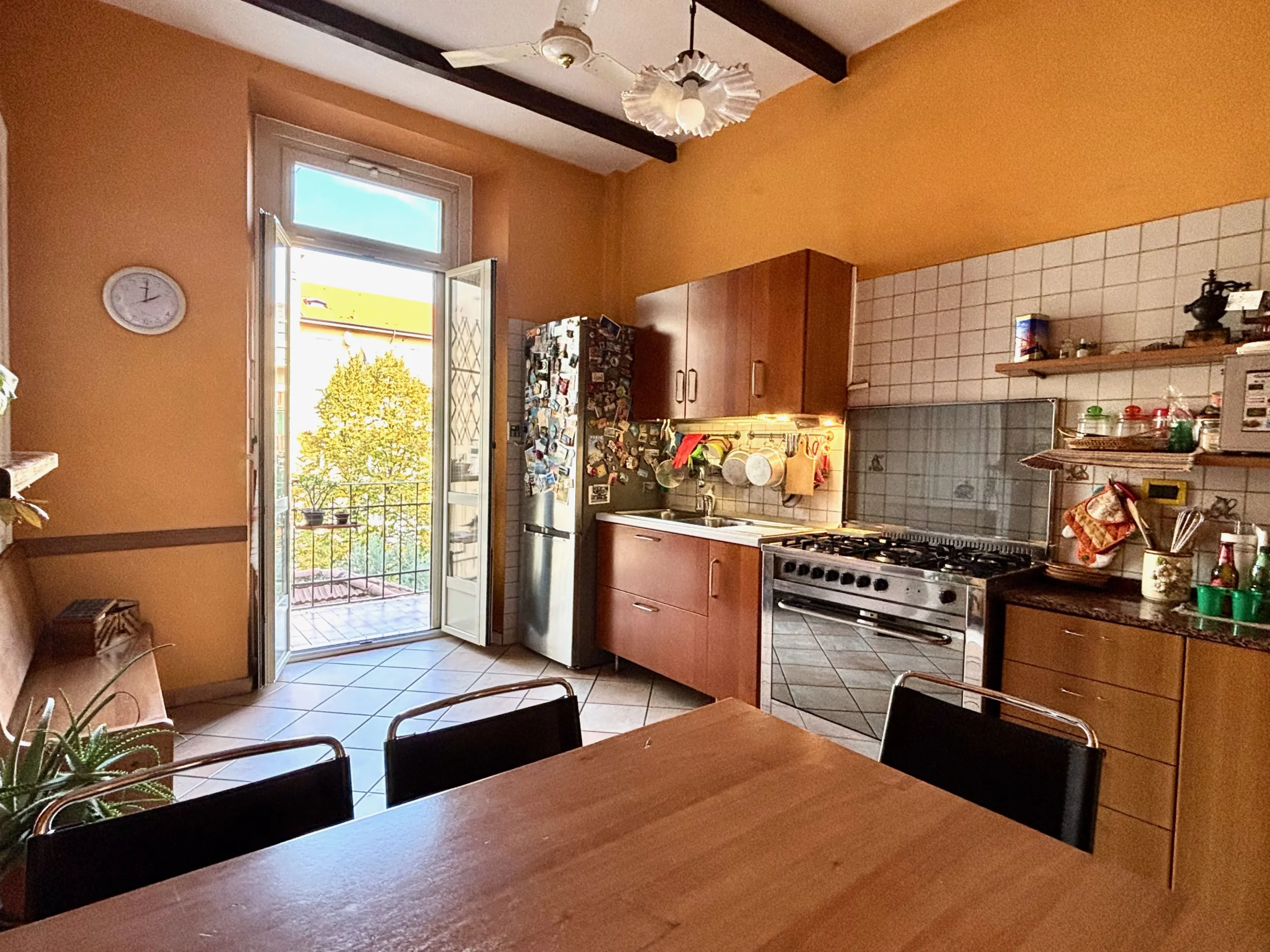 La cucina, ampia e ariosa, si apre tramite una porta finestra sul balcone verso il cortile. Un comodo armadio a muro è perfetto come dispensa. Gradevole la vista aperta sul verde.