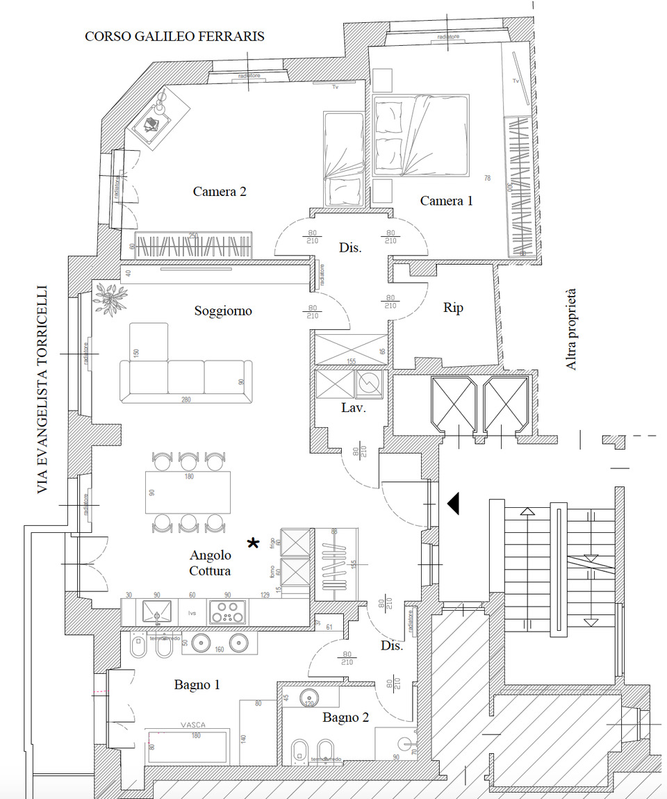 Ingresso, zona giorno open space con cucina abitabile , due camere, due bagni, lavanderia, cabina armadi e terzo bagno lavanderia. Terzo piano con ascensore, doppia esposizione, appena ristrutturato (termine lavori previsto per fine luglio 2023), Corso Galileo Ferraris 123bis, Torino.