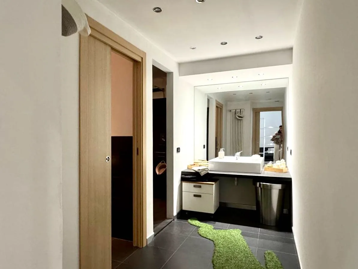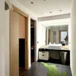 Di fronte all’ingresso una cabina armadi organizza lo spazio storage in maniera funzionale e pratica