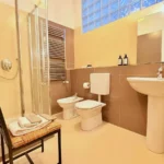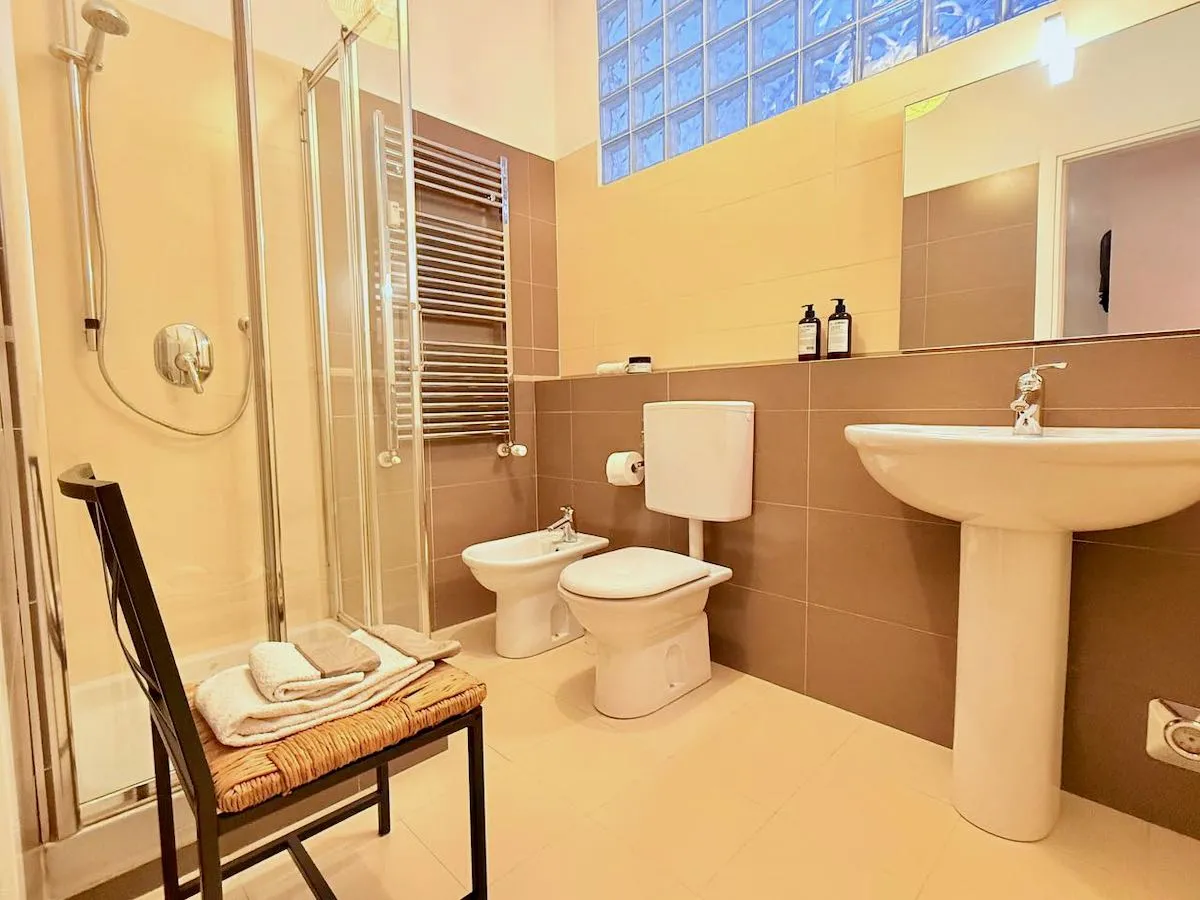 Tra la zona notte e la zona giorno si trova il bagno con doccia di generose dimensioni con la parte più alta in vetrocemento per consentire un’illuminazione naturale degli spazi.