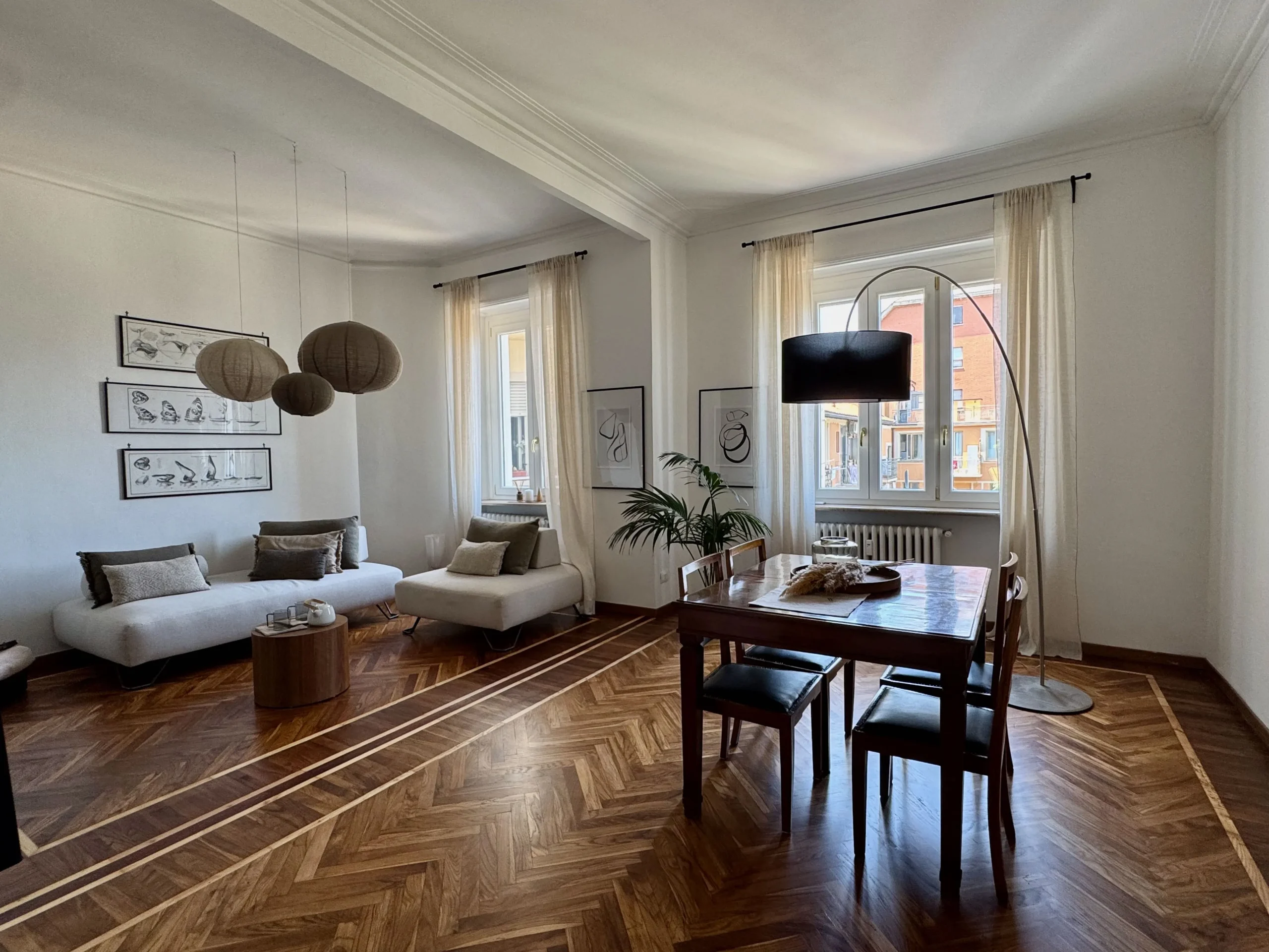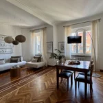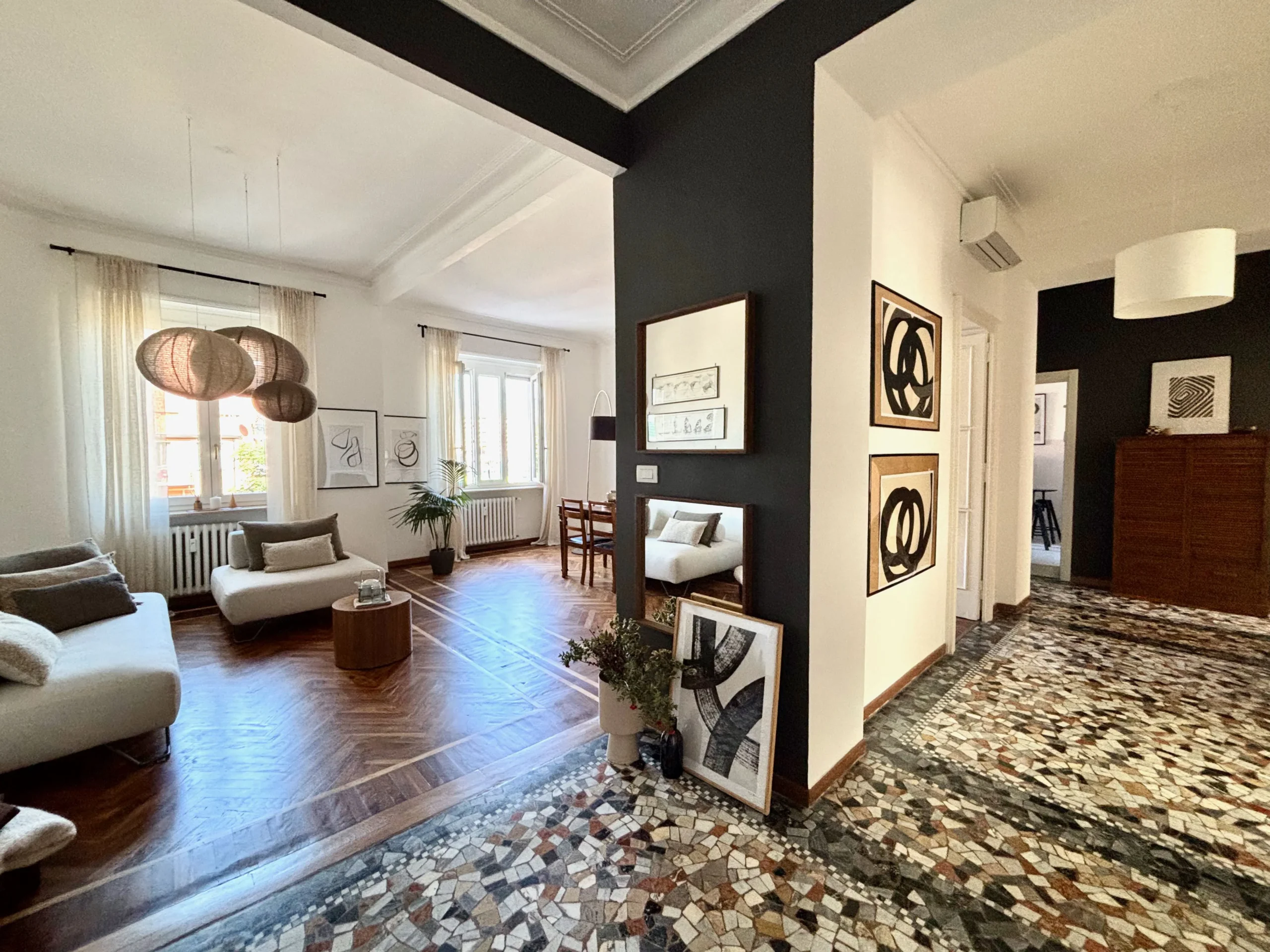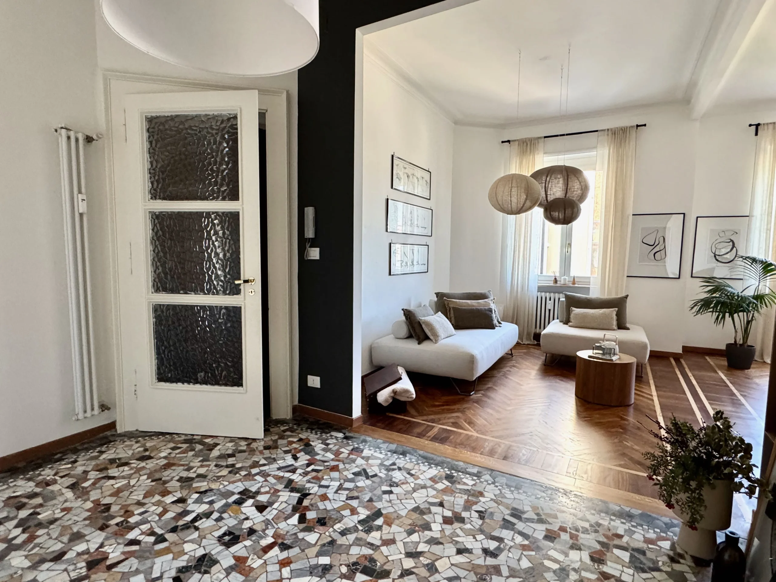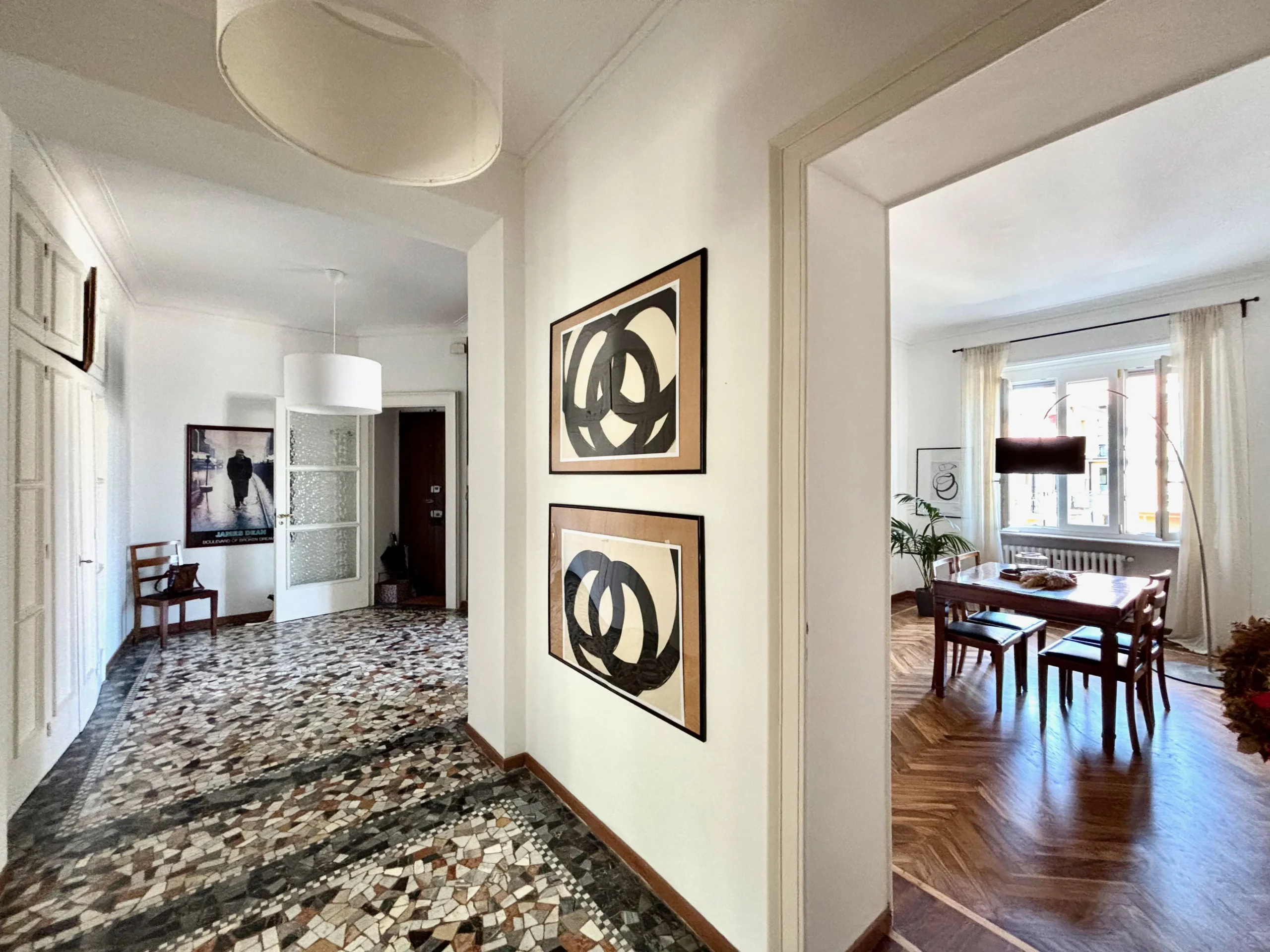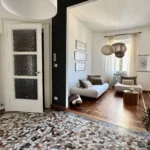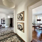 L’appartamento si trova al terzo piano di uno stabile anni ’40 molto elegante con ampio ascensore. L’ingresso è ampio e largamente sfruttabile con apertura sul luminosissimo salone doppio. Questo spazio, perfetto per momenti di convivialità o relax in famiglia, è reso ancora più elegante dall’accostamento tra tinte chiare delle pareti e parquet in legno che si unisce al pavimento in marmo alla palladiana.