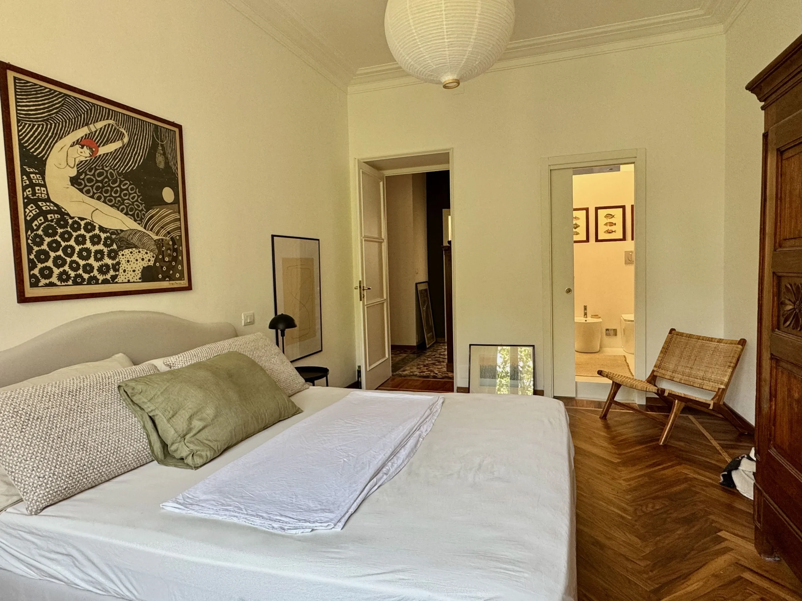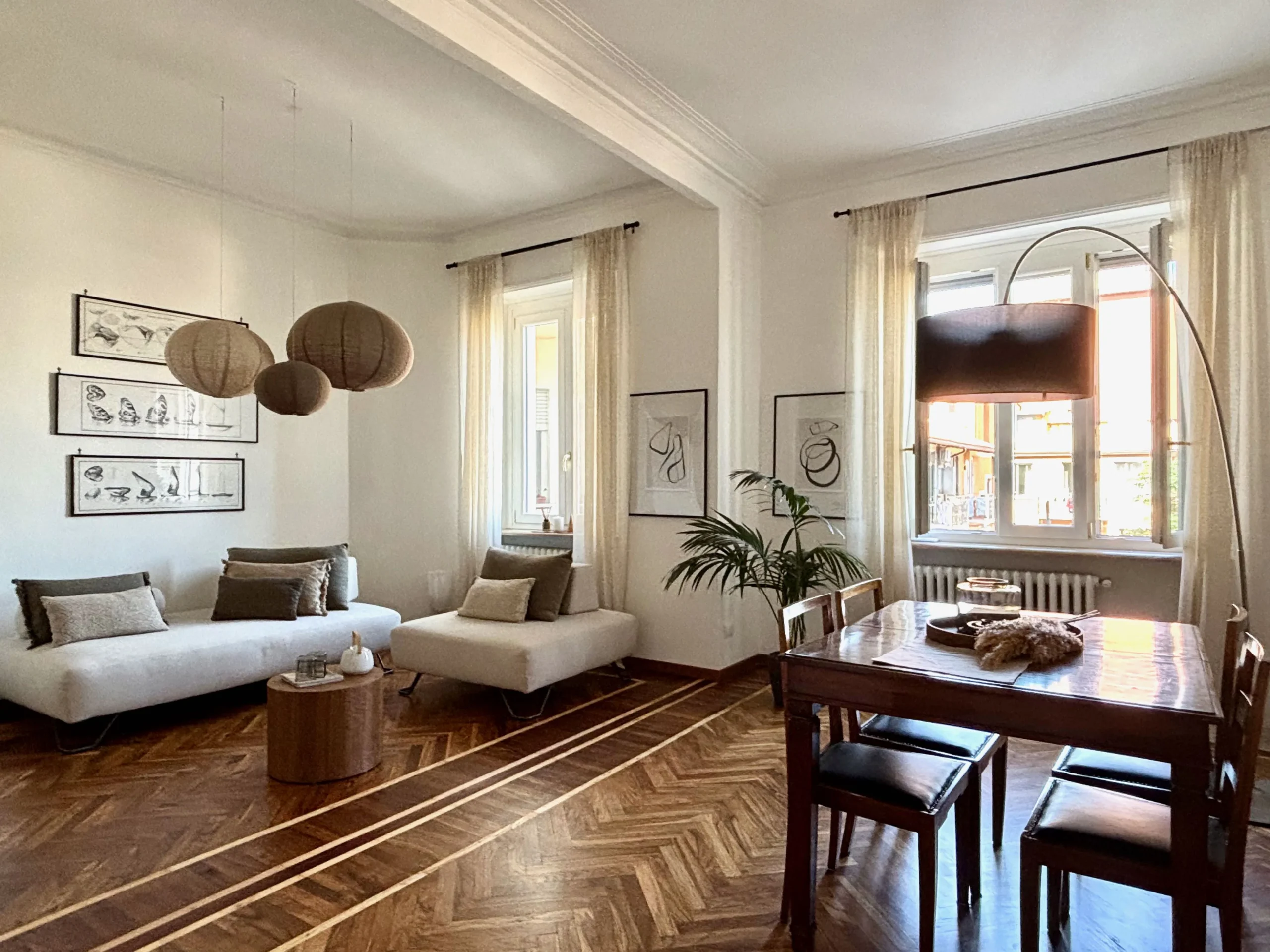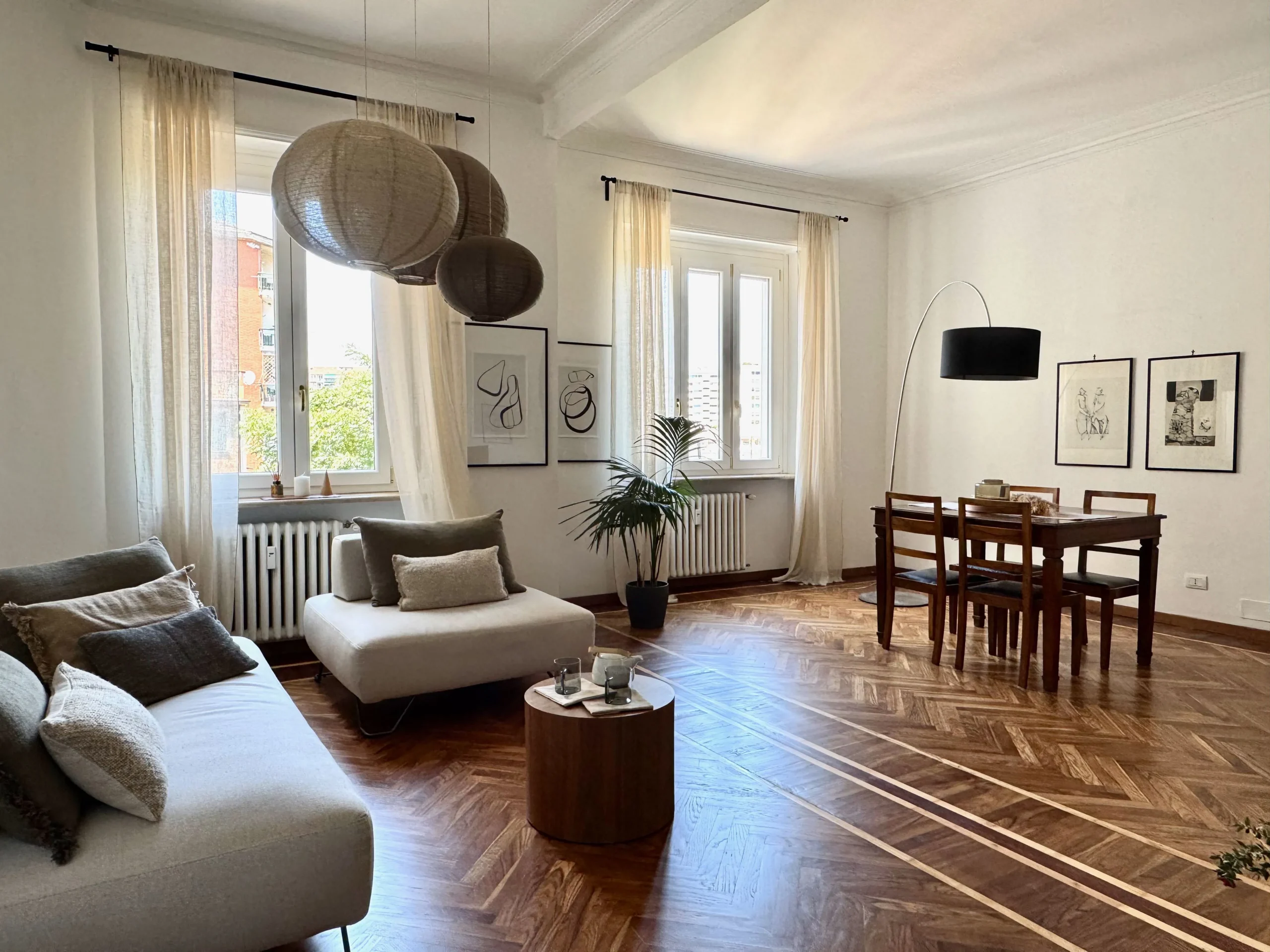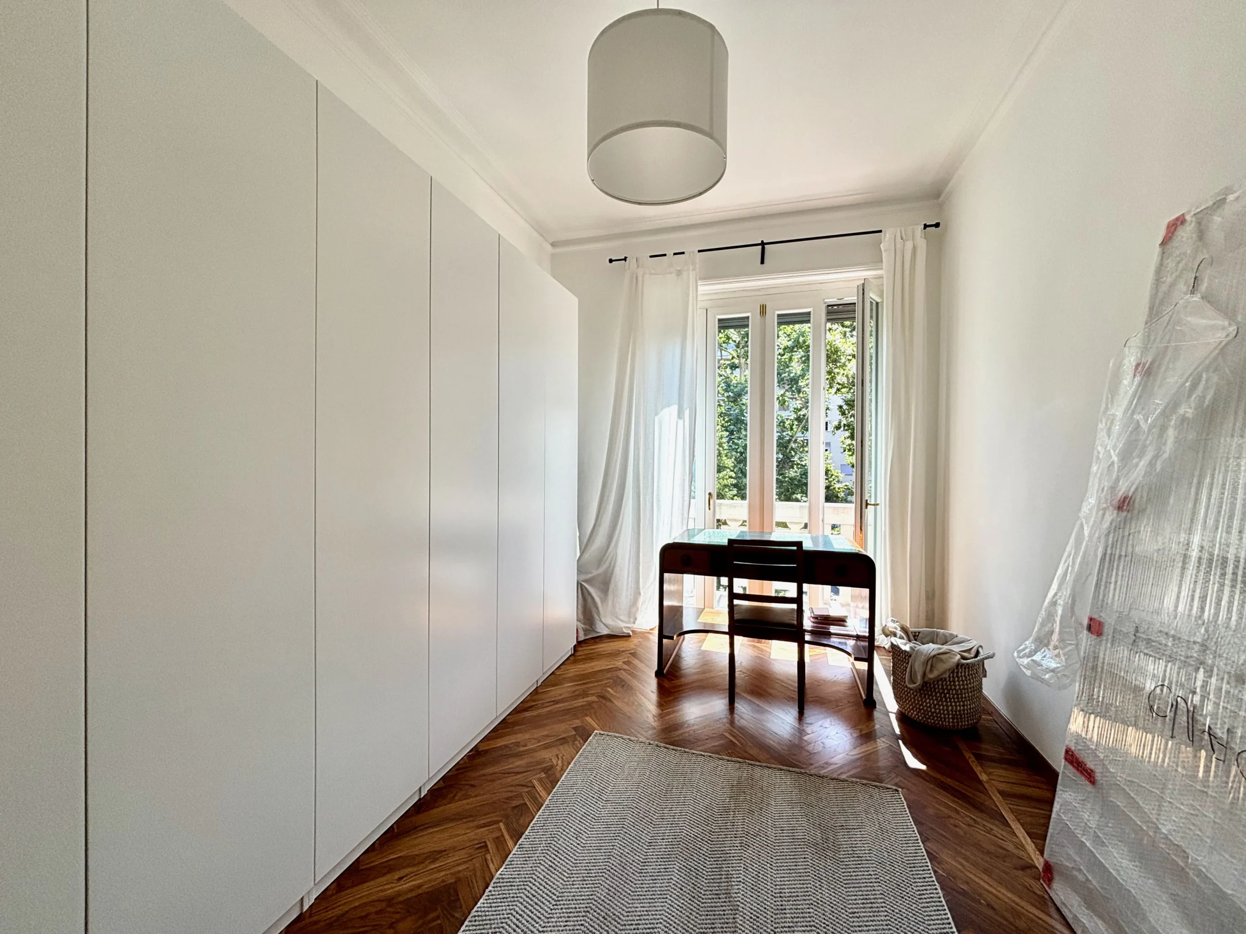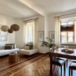 L’appartamento si trova al terzo piano di uno stabile anni ’40 molto elegante con ampio ascensore. L’ingresso è ampio e largamente sfruttabile con apertura sul luminosissimo salone doppio. Questo spazio, perfetto per momenti di convivialità o relax in famiglia, è reso ancora più elegante dall’accostamento tra tinte chiare delle pareti e parquet in legno che si unisce al pavimento in marmo alla palladiana.