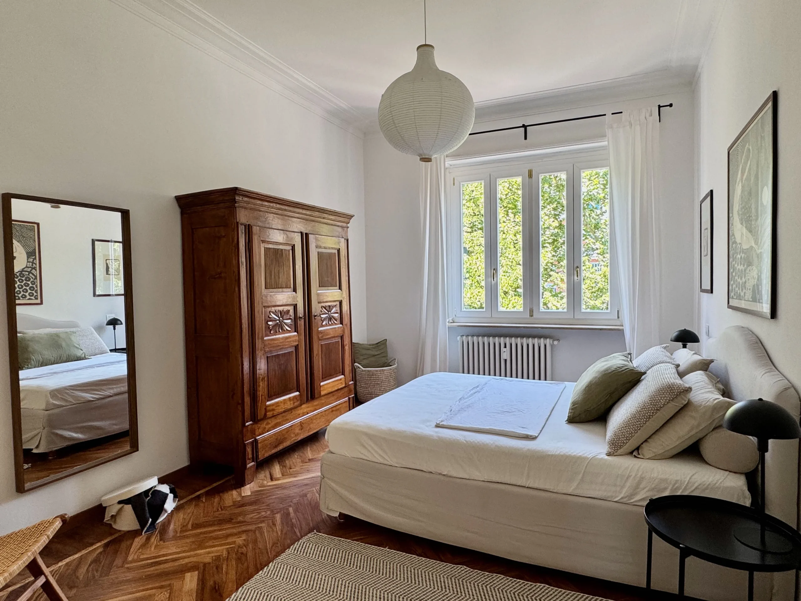 Il letto matrimoniale e la grande finestra sulla piazza con la vista sugli alberi rendono questa camera intima e tranquilla.