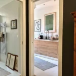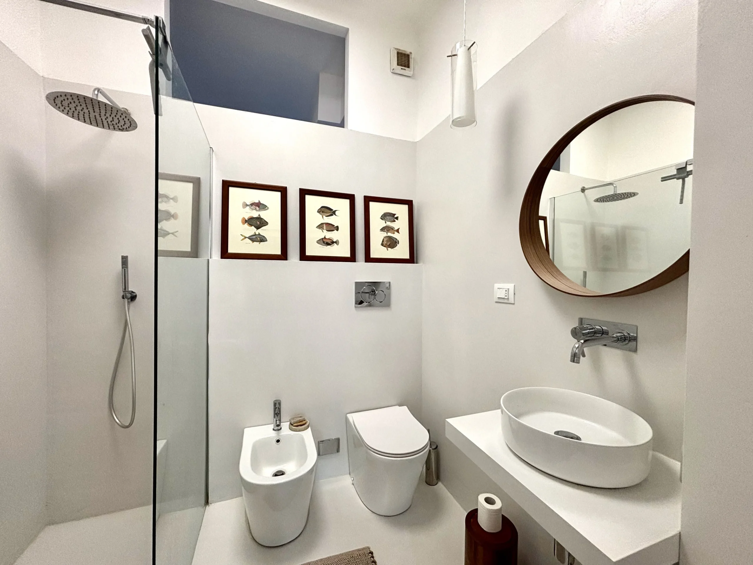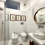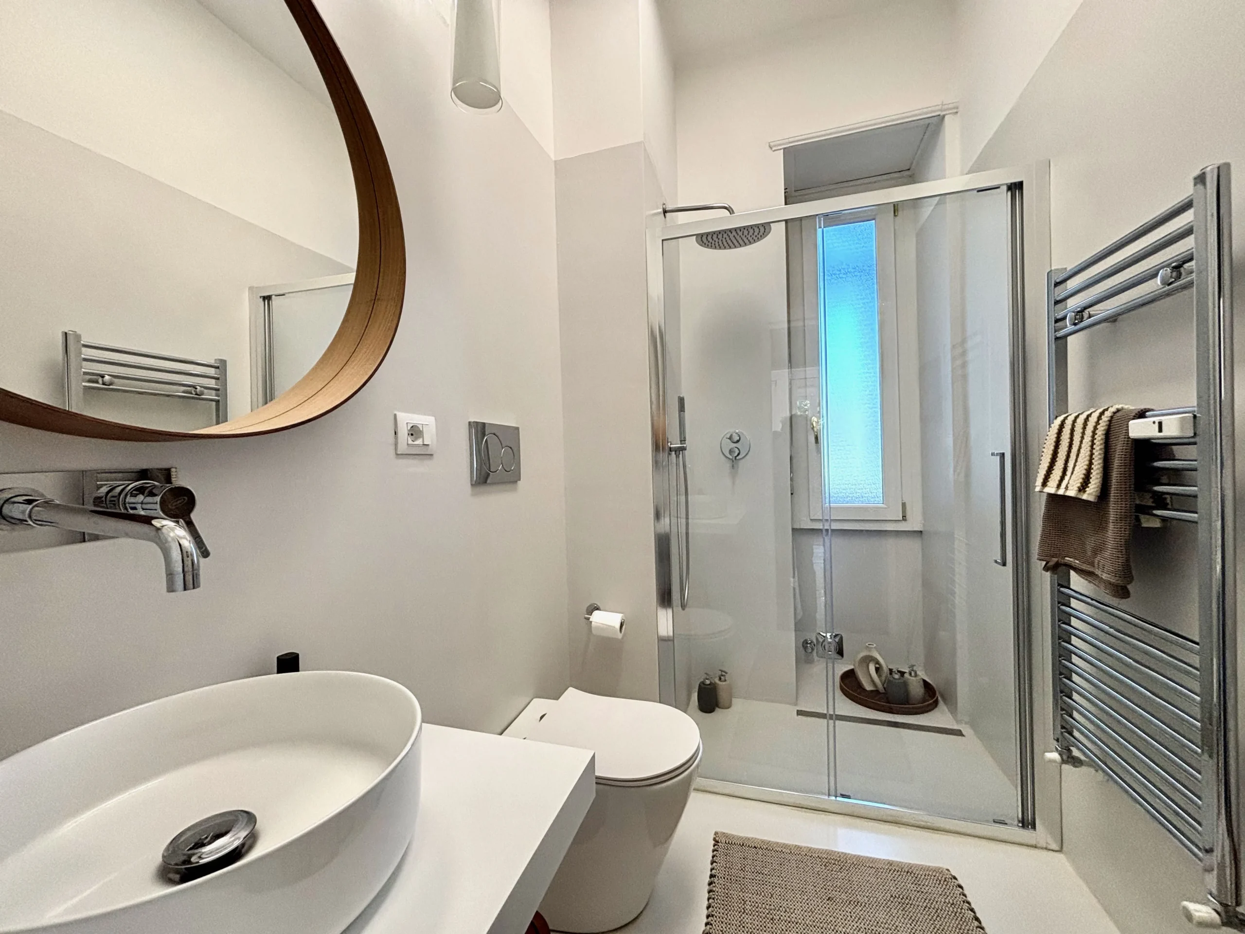 Il secondo bagno di servizio, finestrato e con doccia al fondo, è in uso alla zona giorno con ingresso dal corridoio centrale, nascosto dietro una porta scorrevole.