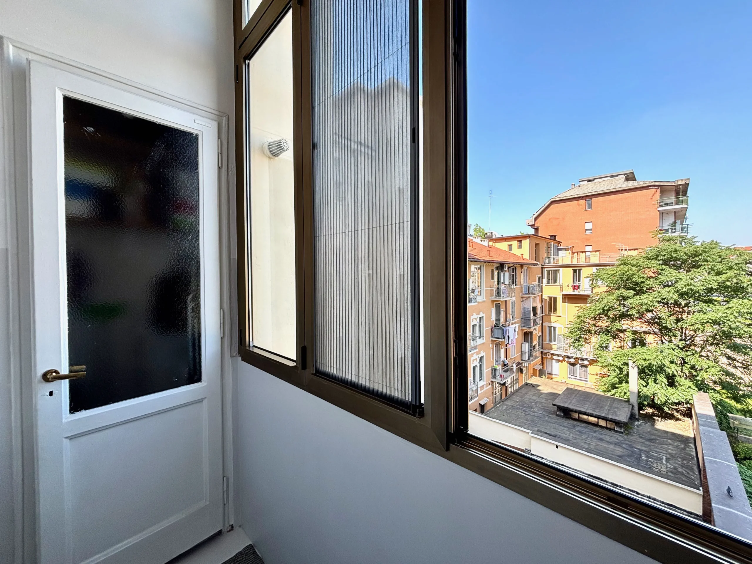 La seconda camera ha ampia metratura, la porta finestra con balcone affaccia proprio sugli alberi.