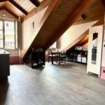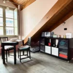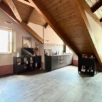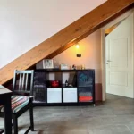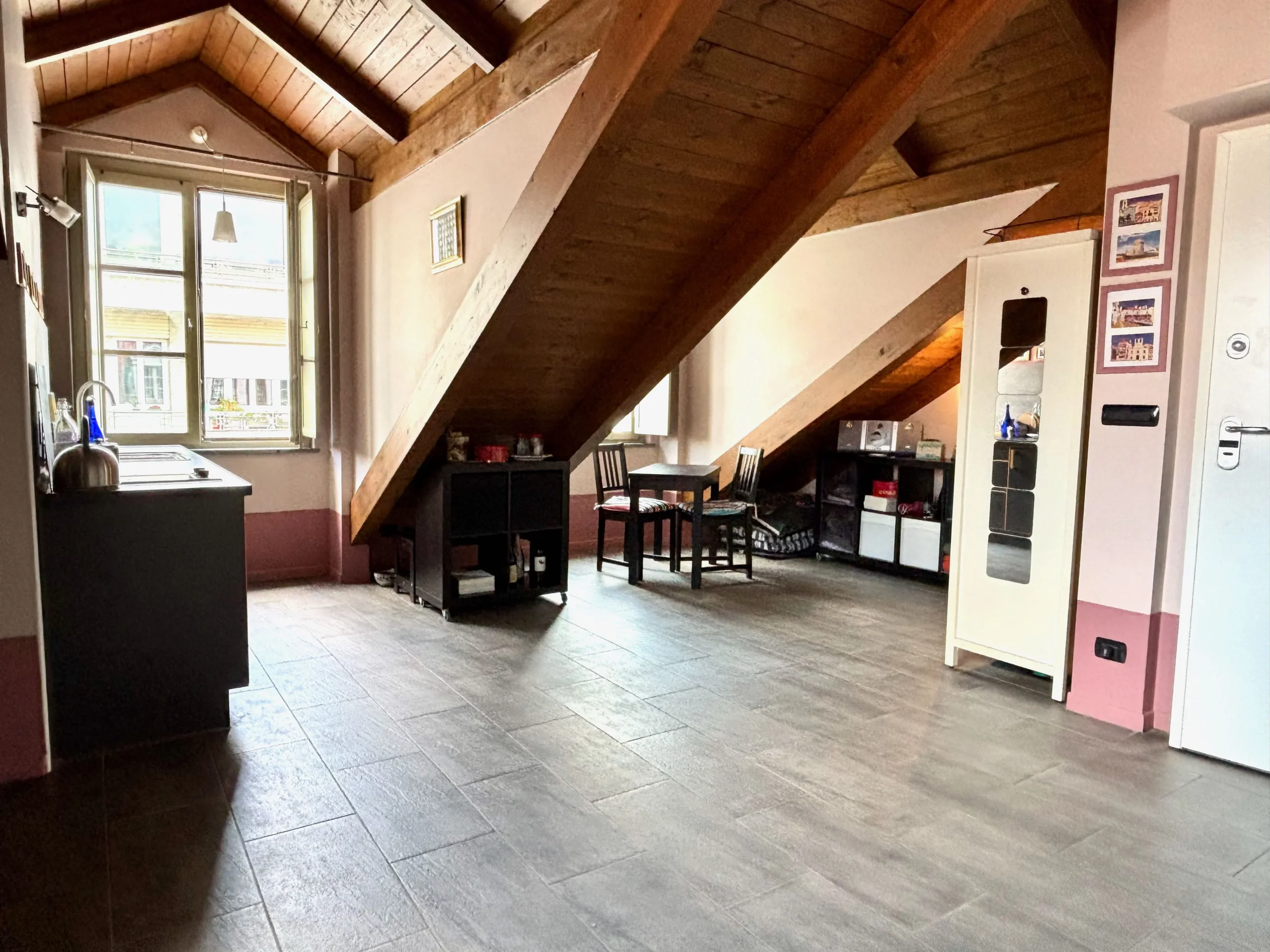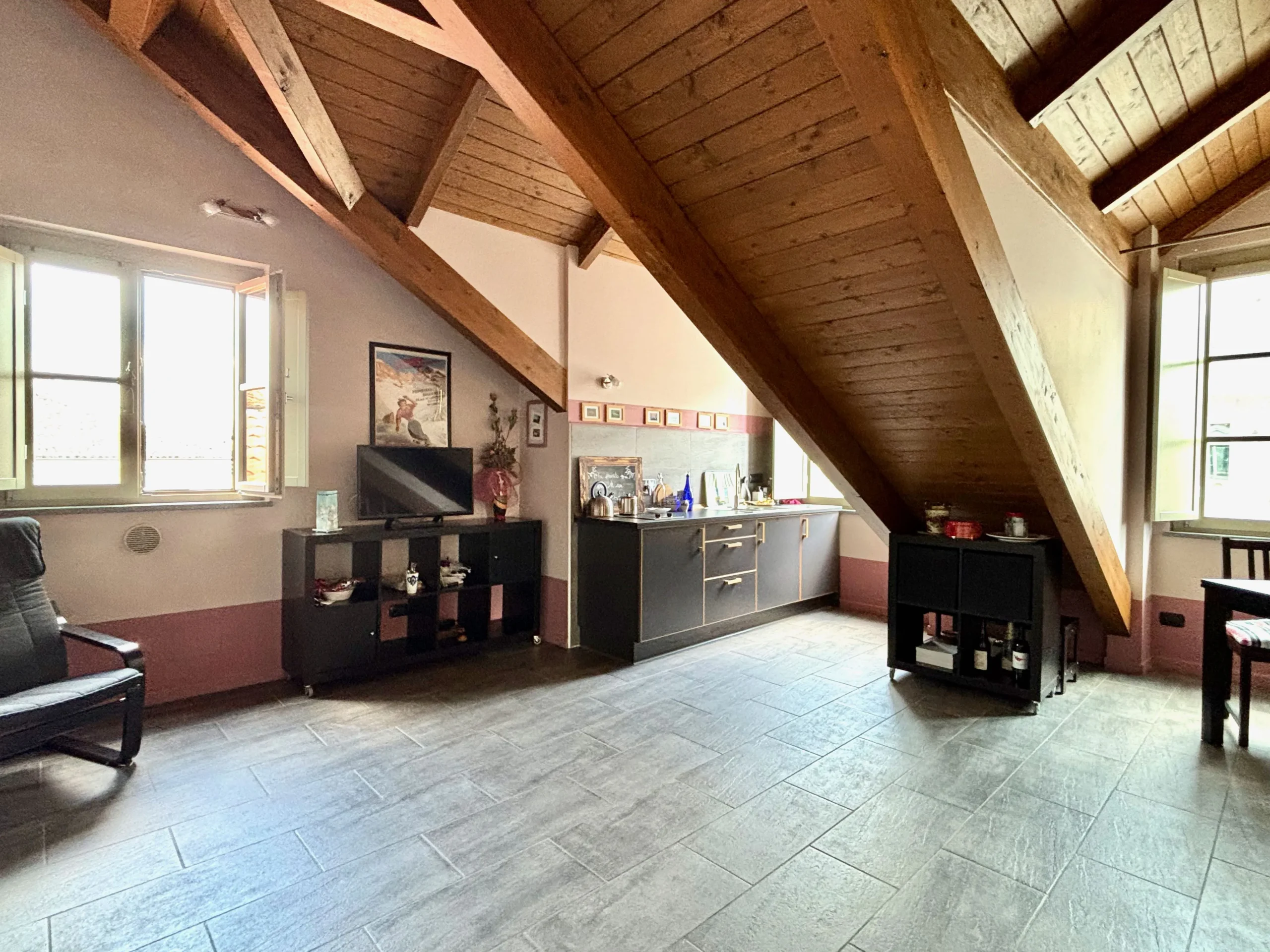 L’ingresso apre sulla zona giorno angolare con cucina a vista. Due grandi abbaini lasciano entrare la luce e incorniciano gli scorci più autentici della città. Le altezze generose permettono di immaginare un soppalco arredo, perfetto per dare movimento e personalità allo spazio.