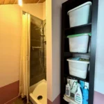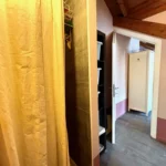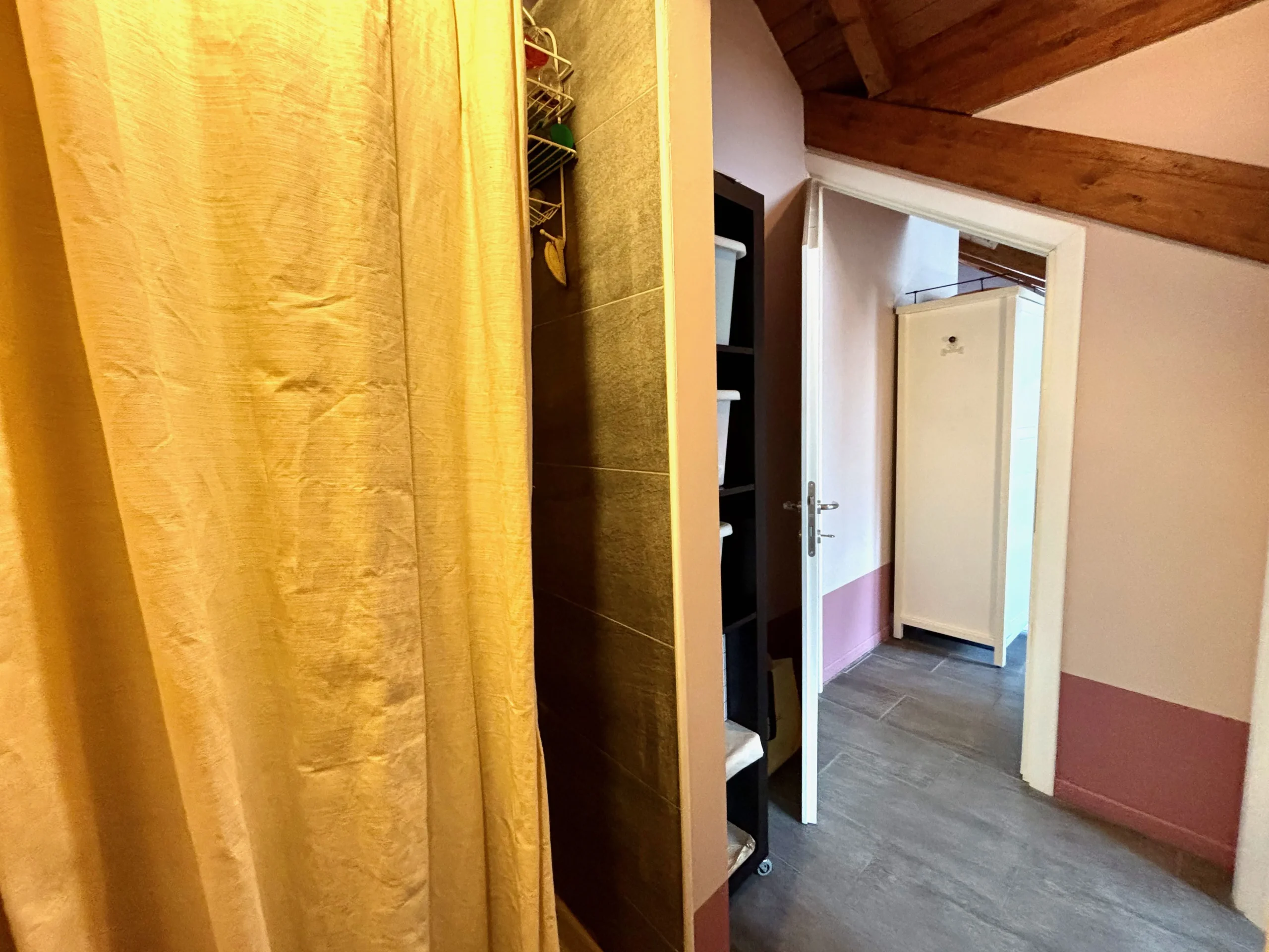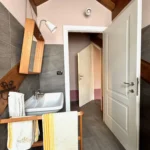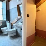 Il bagno è un gioiello: travi a vista in legno, dettagli in pietra e sanitari moderni dialogano in equilibrio. La zona doccia, posizionata nella parte più alta, si accompagna a un comodo ripostiglio.