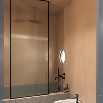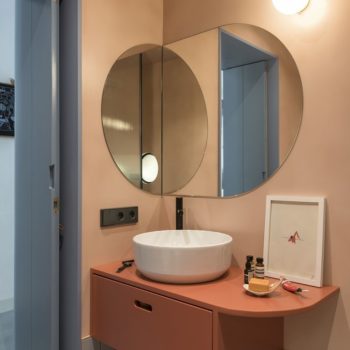 La ristrutturazione dell’appartamento unisce materiali preziosi e arredi firmati con elementi più semplici. La grande vetrata del salone che affaccia sul verde balcone permette alla luce di inondare tutto lo spazio. Il punto focale della casa è, però, il bagno che si trova situato al centro della pianta dell’appartamento. L’ingresso della sala da bagno è mimetizzato tra le porte degli armadi color blu marino, e al suo interno le pareti sono dipinte a contrasto nella tonalità Pantone 2019 Living Coral accompagnate da rubinetti e soffione in finitura nera opaca. L’oblò, coperto di vetro, fa capolino nella parete del box doccia, così da dar sfogo sulla zona giorno principale. Nella parte posteriore dell’appartamento troviamo due camere da letto arredate con lo stesso stile decorativo.